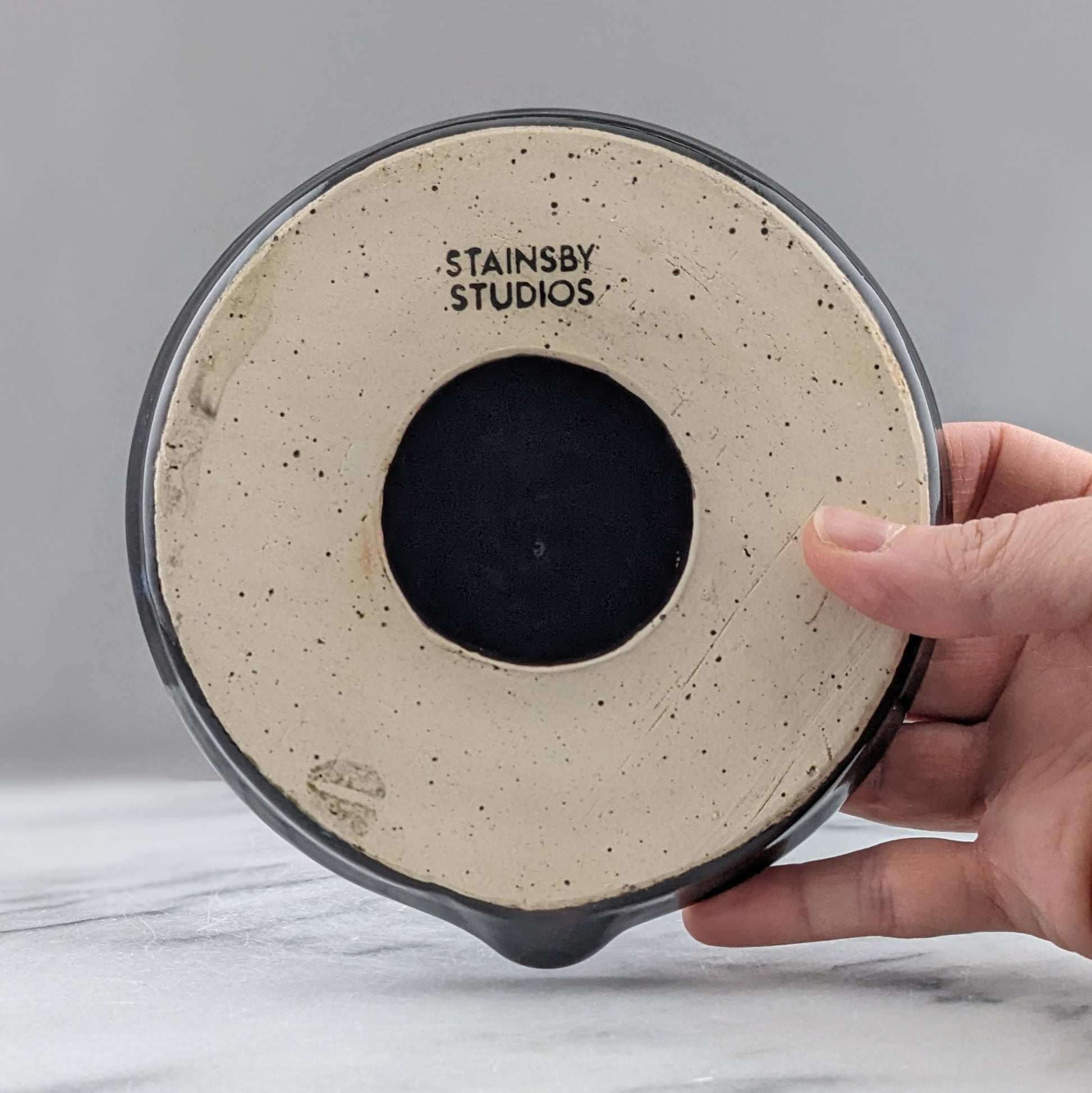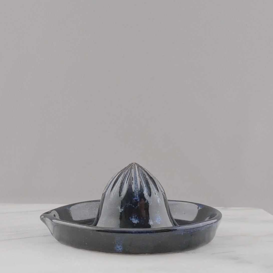 Indulge in the opulent beauty of our handmade juicer, coated in a glossy black and blue glaze. Savour the delightful flavour of freshly pressed juice with our meticulously handcrafted juicer. Juicer is 4.75 inches wide and 2.25 inches tall. Made from sturdy stoneware and designed with intricate detail, this piece is also dishwasher safe for effortless maintenance. An essential addition to any luxurious bar or kitchen.