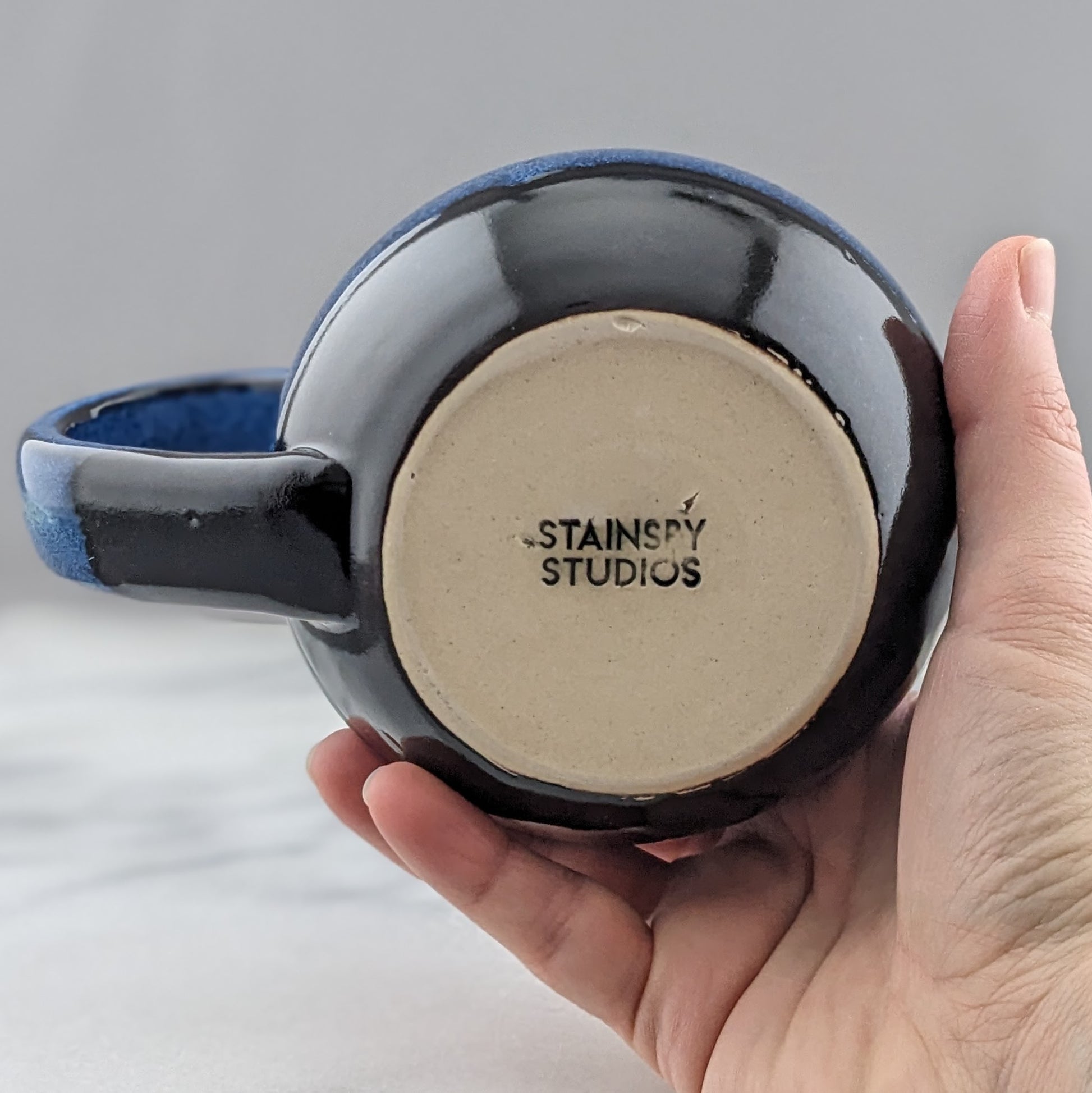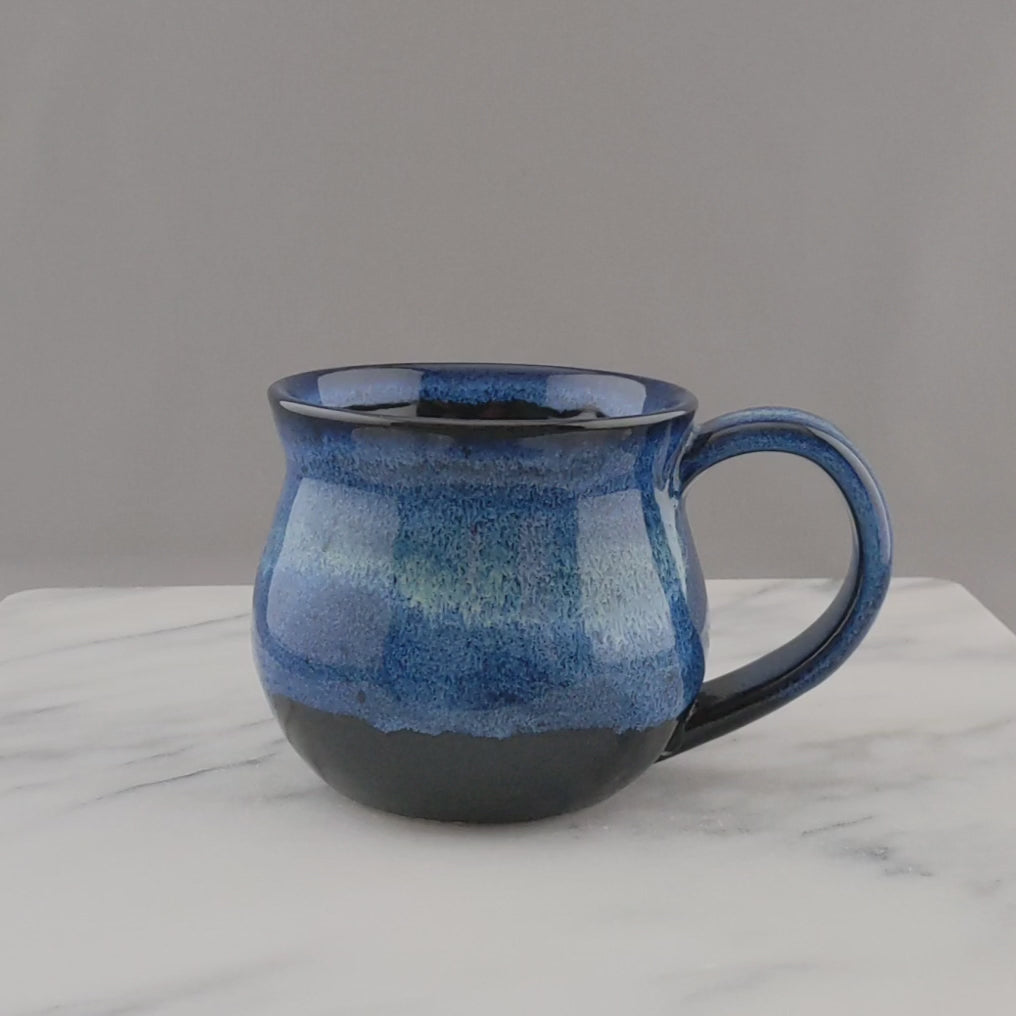This handcrafted ceramic mug features a dazzling blue and black glaze, with a unique cascading effect. This mug holds just over 14.5 fl oz (420 mL) and is 3.75 inches tall and 4 inches wide. It makes a perfect gift for any coffee or tea aficionado. The sturdy stoneware keeps drinks warm, and the mug has a comfortable handle. Packaged in white tissue, it's perfect for the festive season.