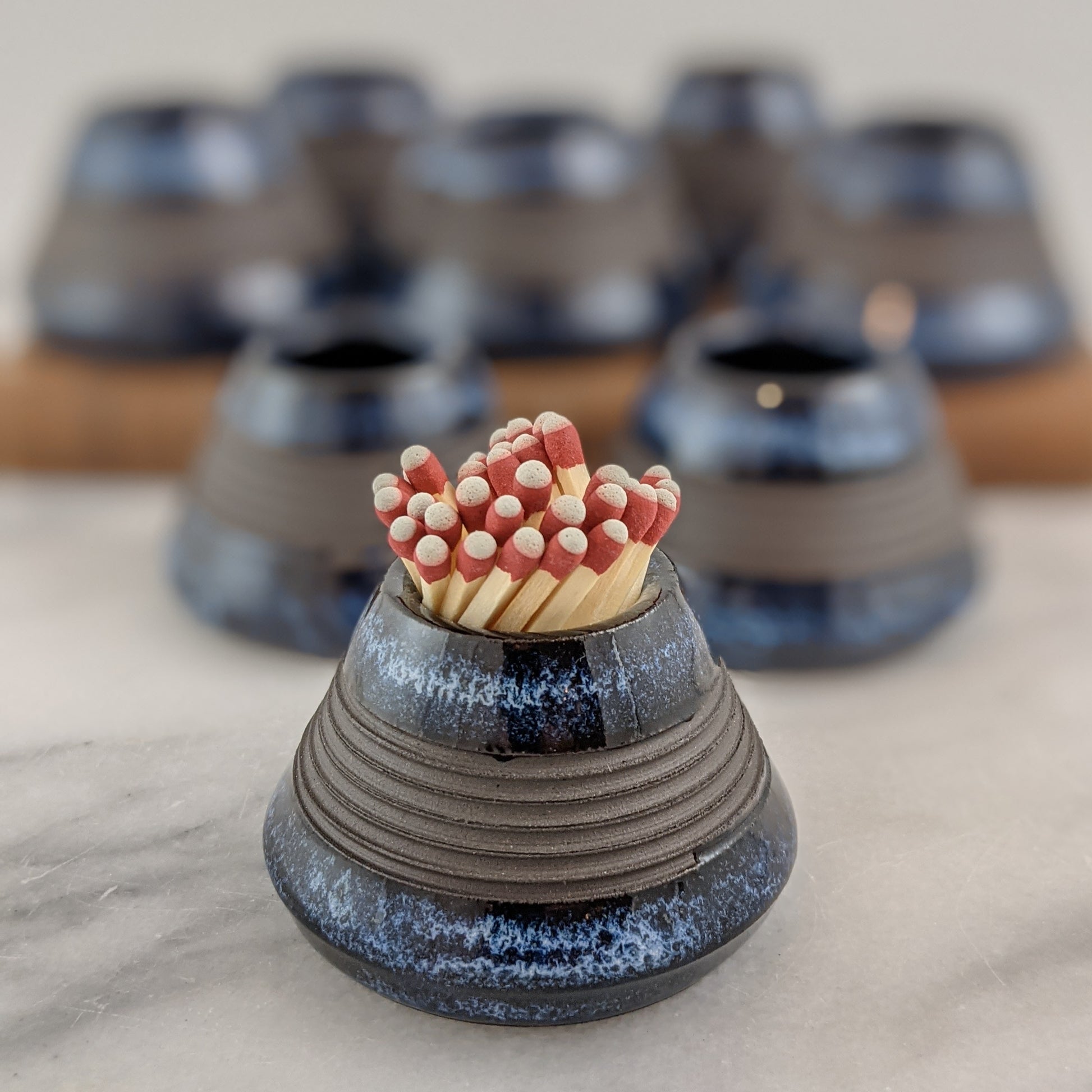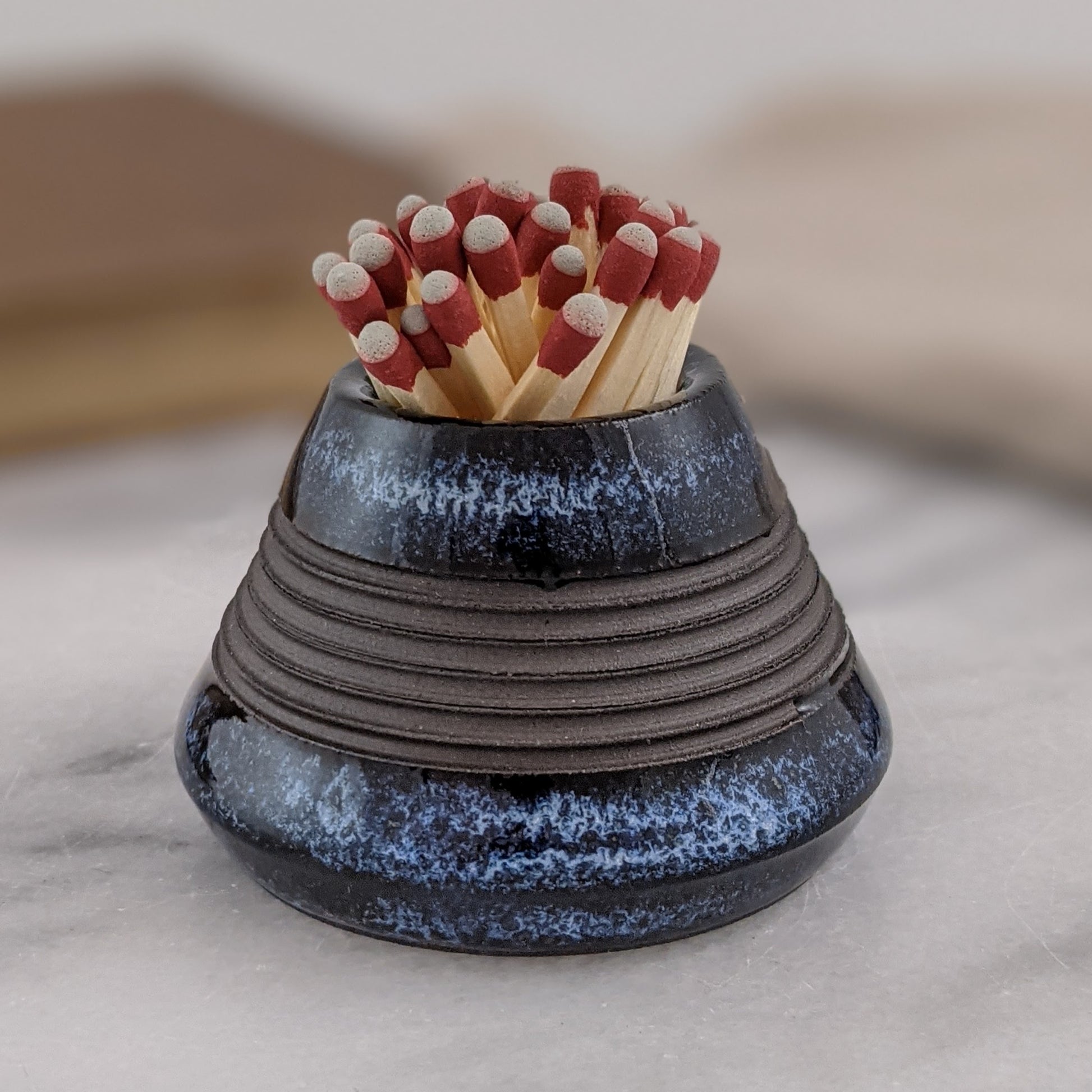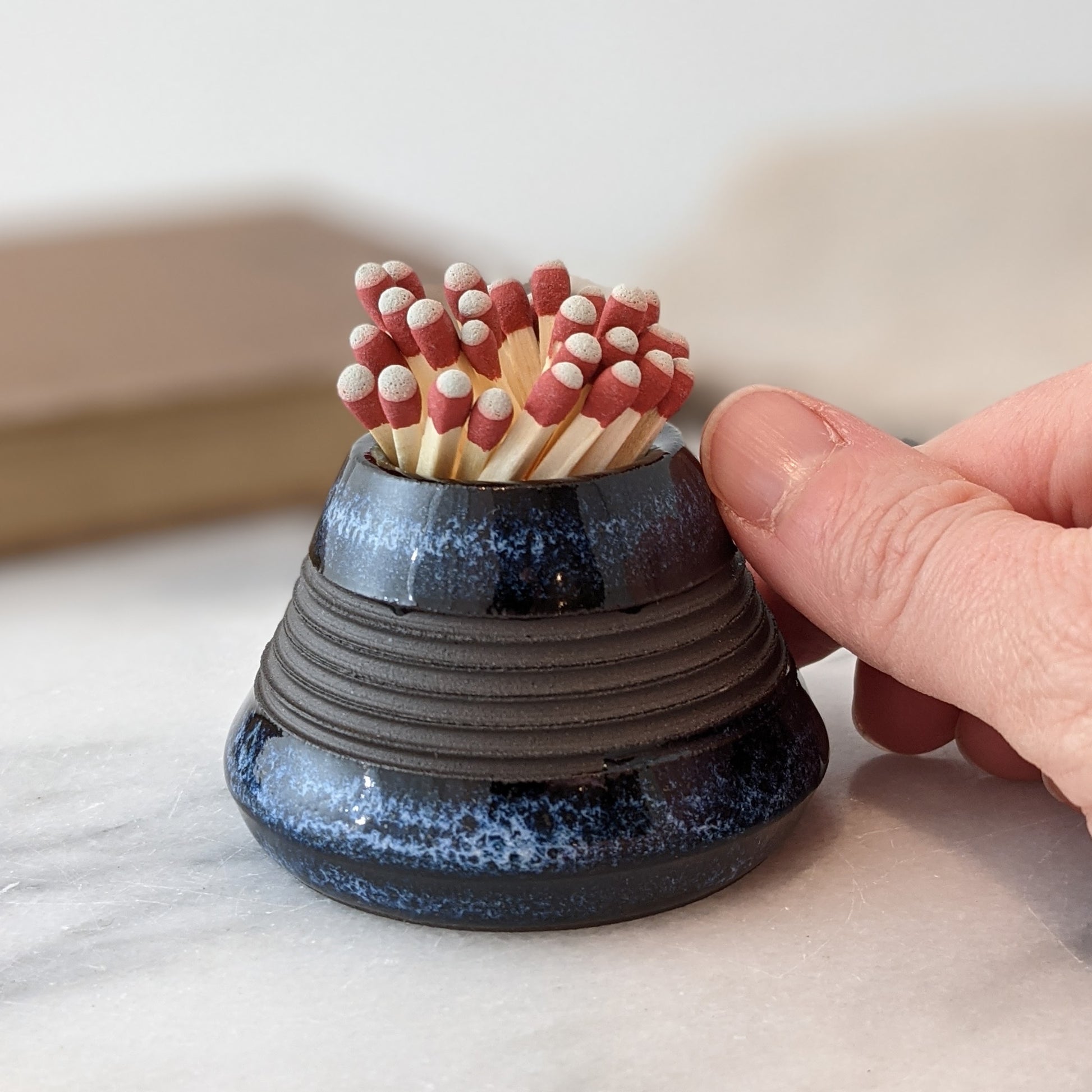 Handmade ceramic match striker in glossy blue over black glaze on black clay. You can use grey tipped strike anywhere matches with the ridges on the match striker by quickly pulling your match along the ridges to light. Solid colour strike-on-the-box matches can be lit using the match striking paper on the base. Match strikers are wrapped in white tissue and packaged in a simple and lovely brown paper box.