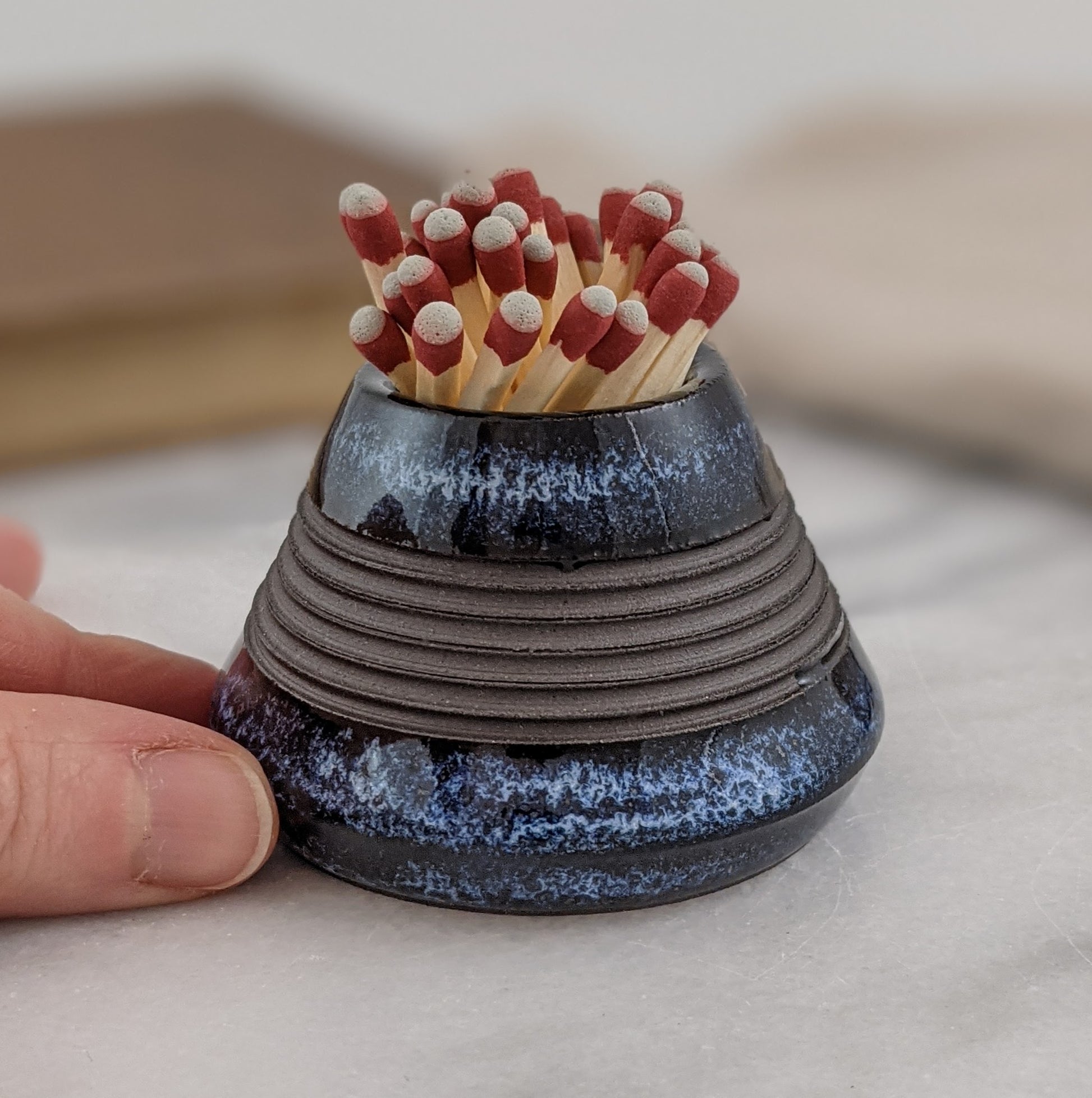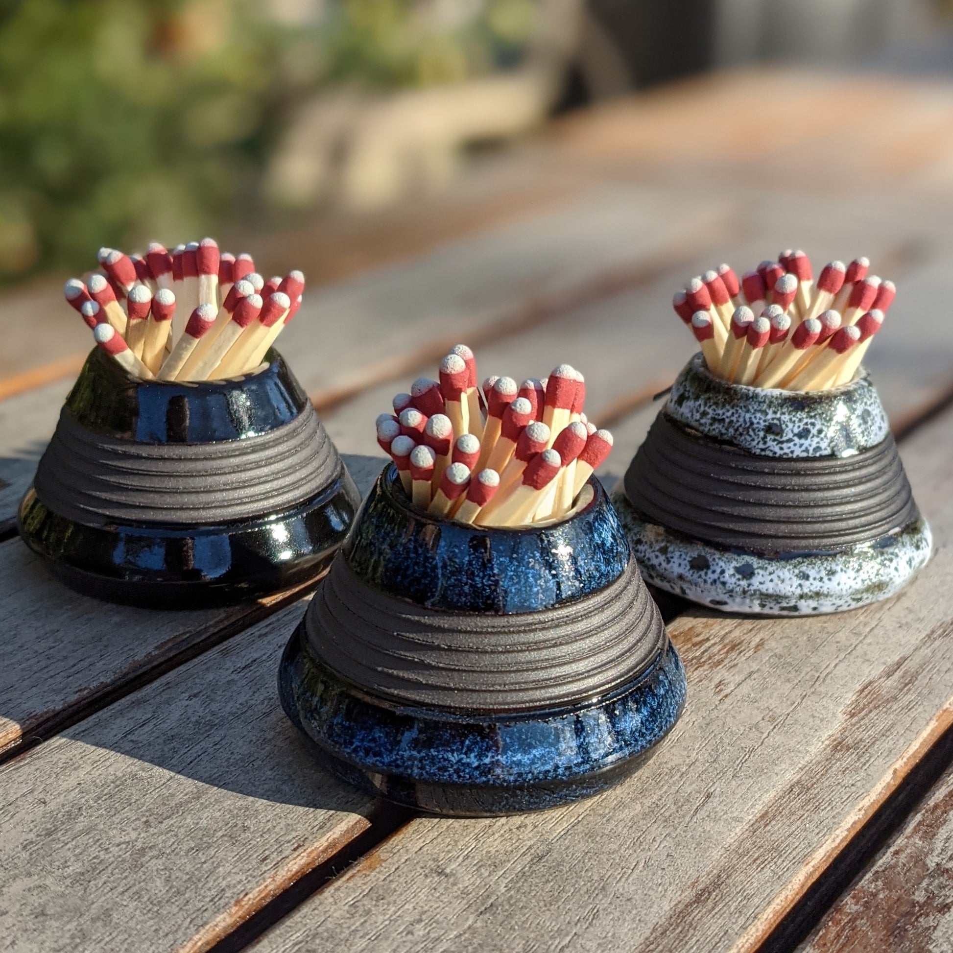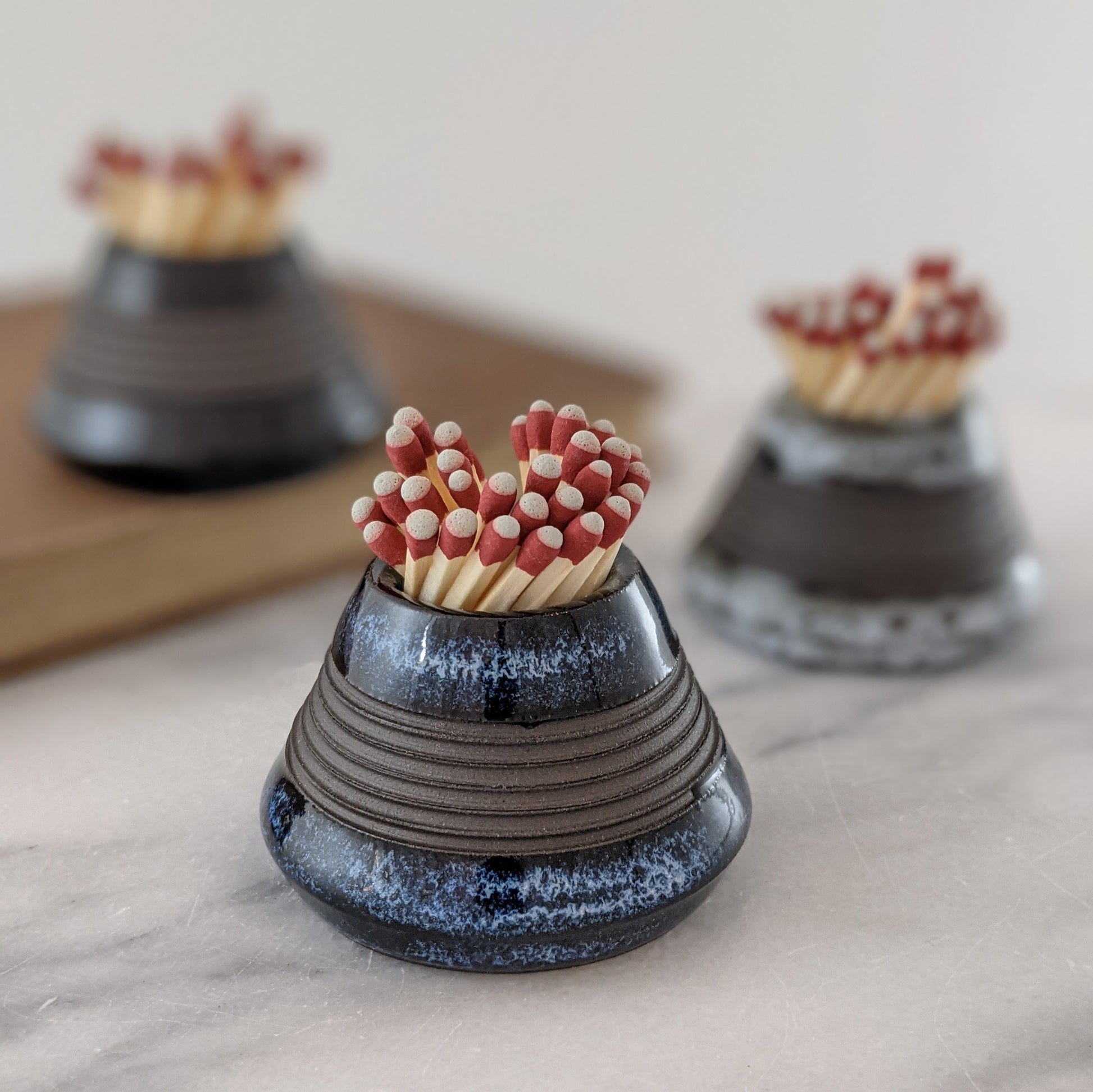 Handmade ceramic match striker in glossy blue over black glaze on black clay. You can use grey tipped strike anywhere matches with the ridges on the match striker by quickly pulling your match along the ridges to light. Solid colour strike-on-the-box matches can be lit using the match striking paper on the base. Match strikers are wrapped in white tissue and packaged in a simple and lovely brown paper box.