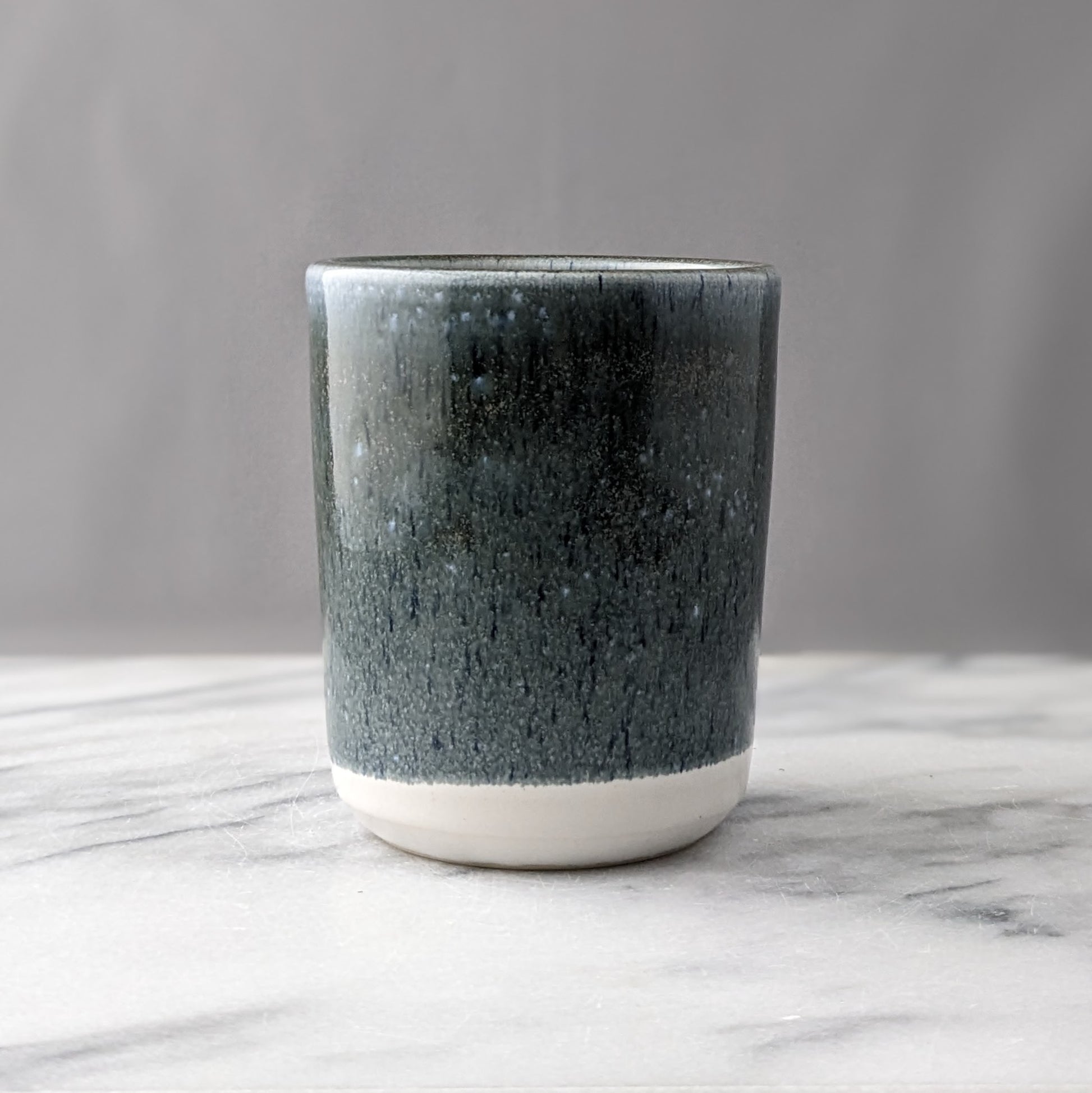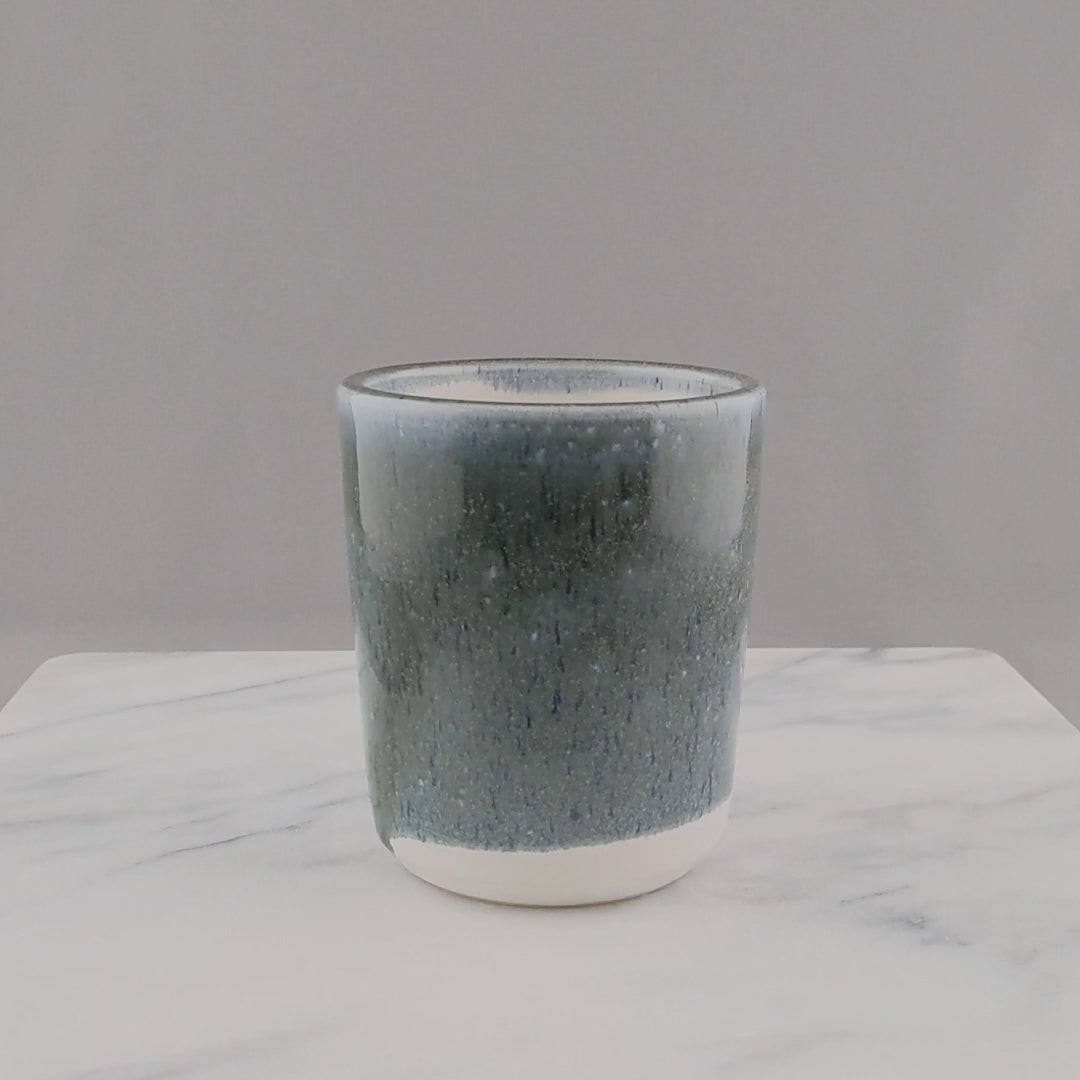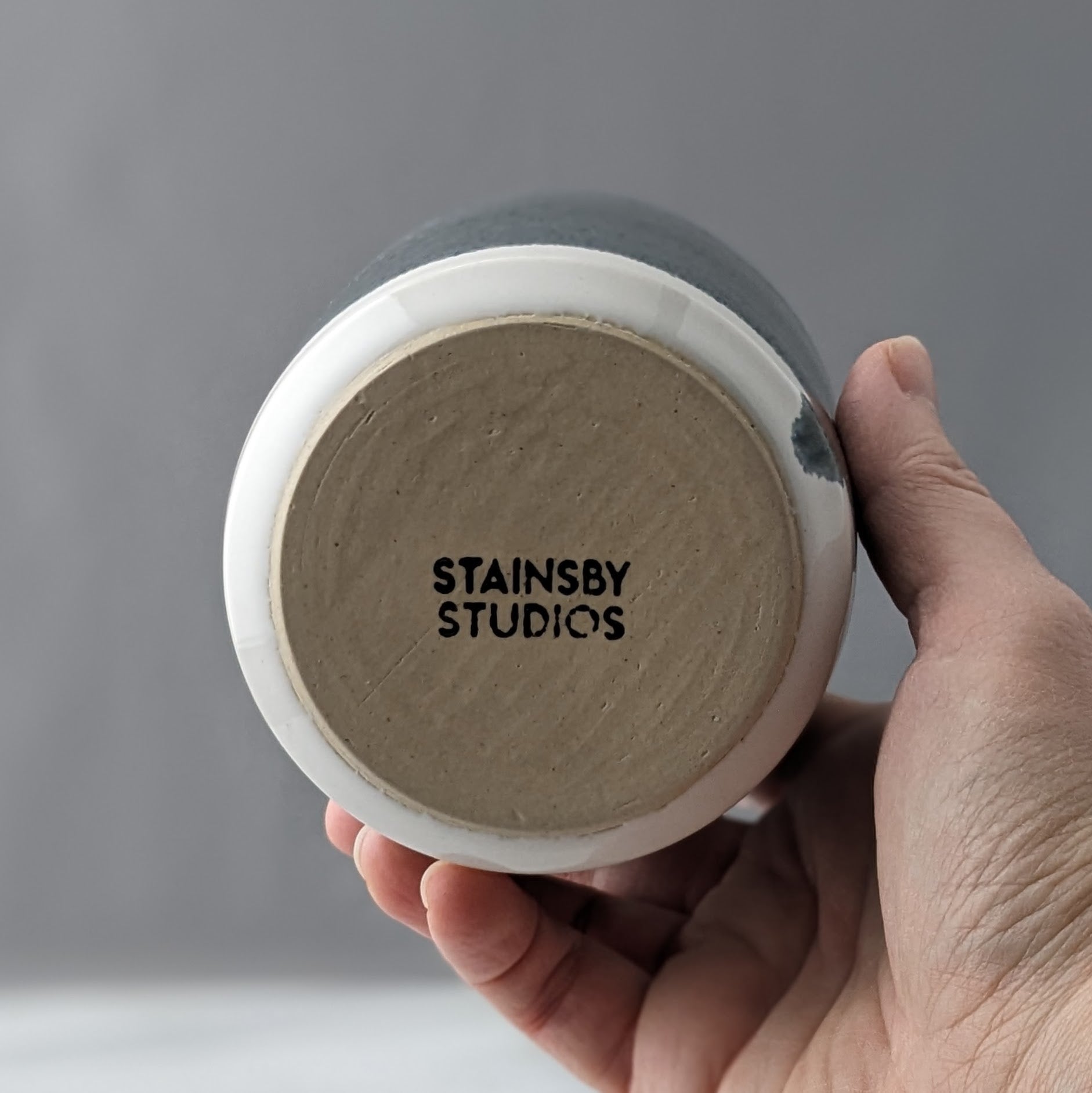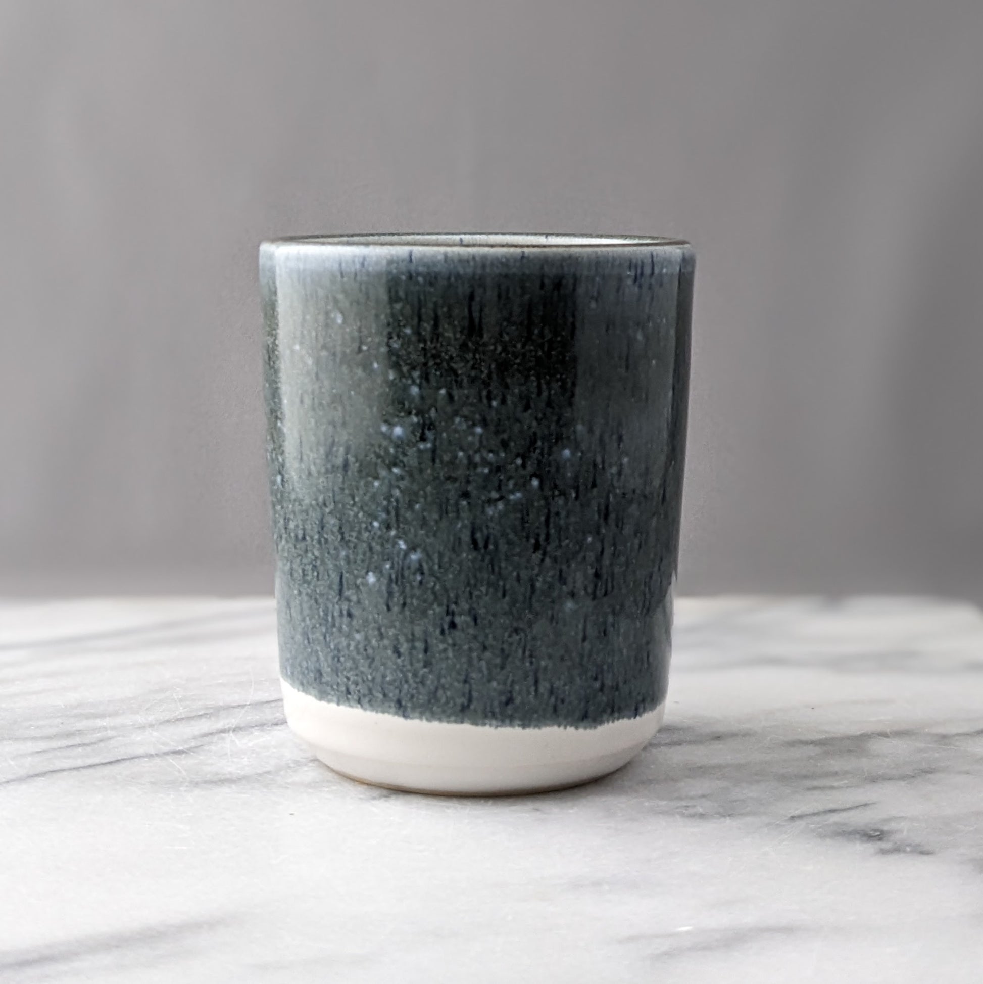 Exquisite craftsmanship meets practicality in this Blue & White Ceramic Cup. This one-of-a-kind cup is meticulously handmade from stoneware clay, beautifully glazed with a speckled blue finish over a pure white base. Cup holds 14 fl ox or 400 mL and is 4.5 in tall and 3.5 in wide. Not only is it a stunning addition to your tableware collection, but its durable construction also keeps your drinks at the perfect temperature - warm or chilled.
