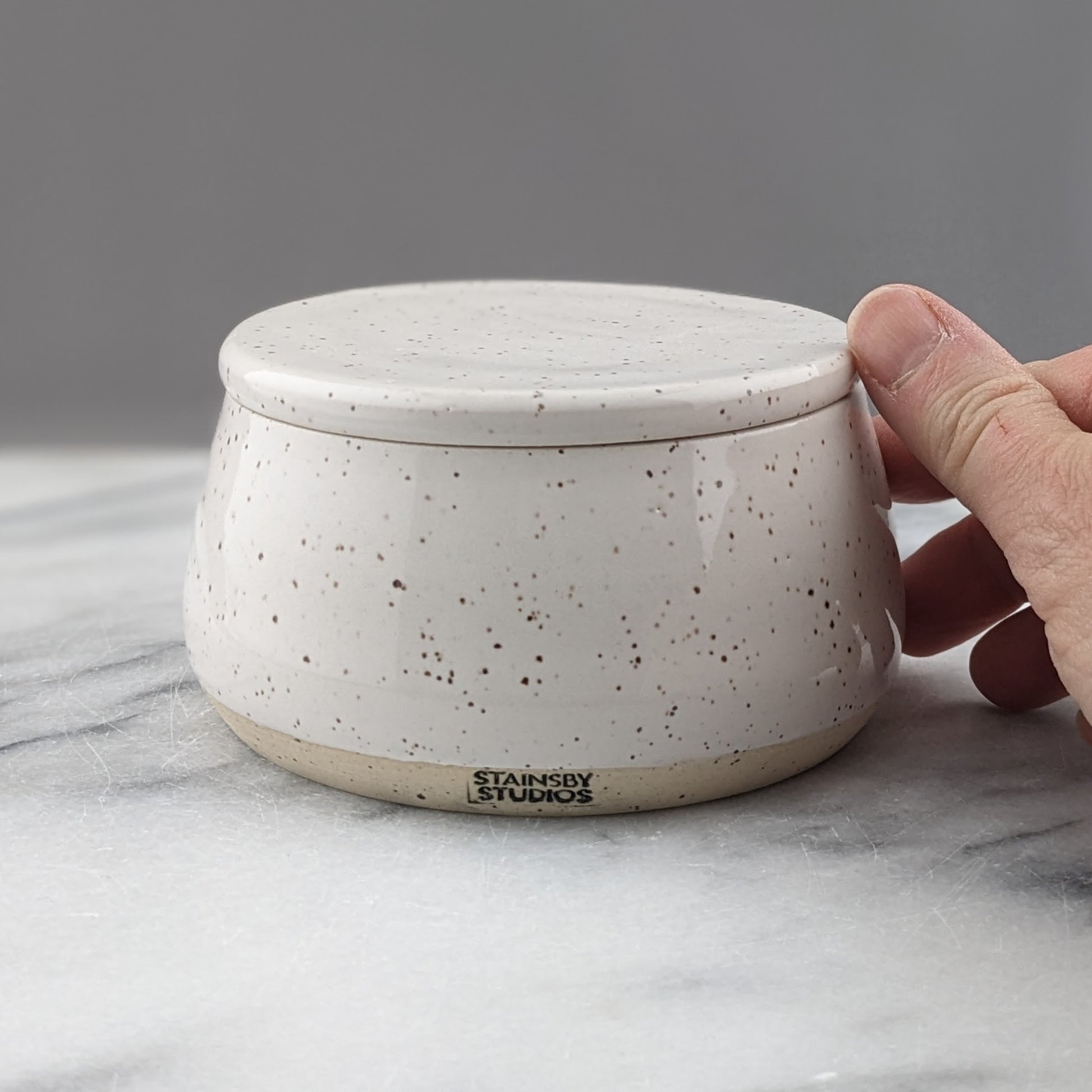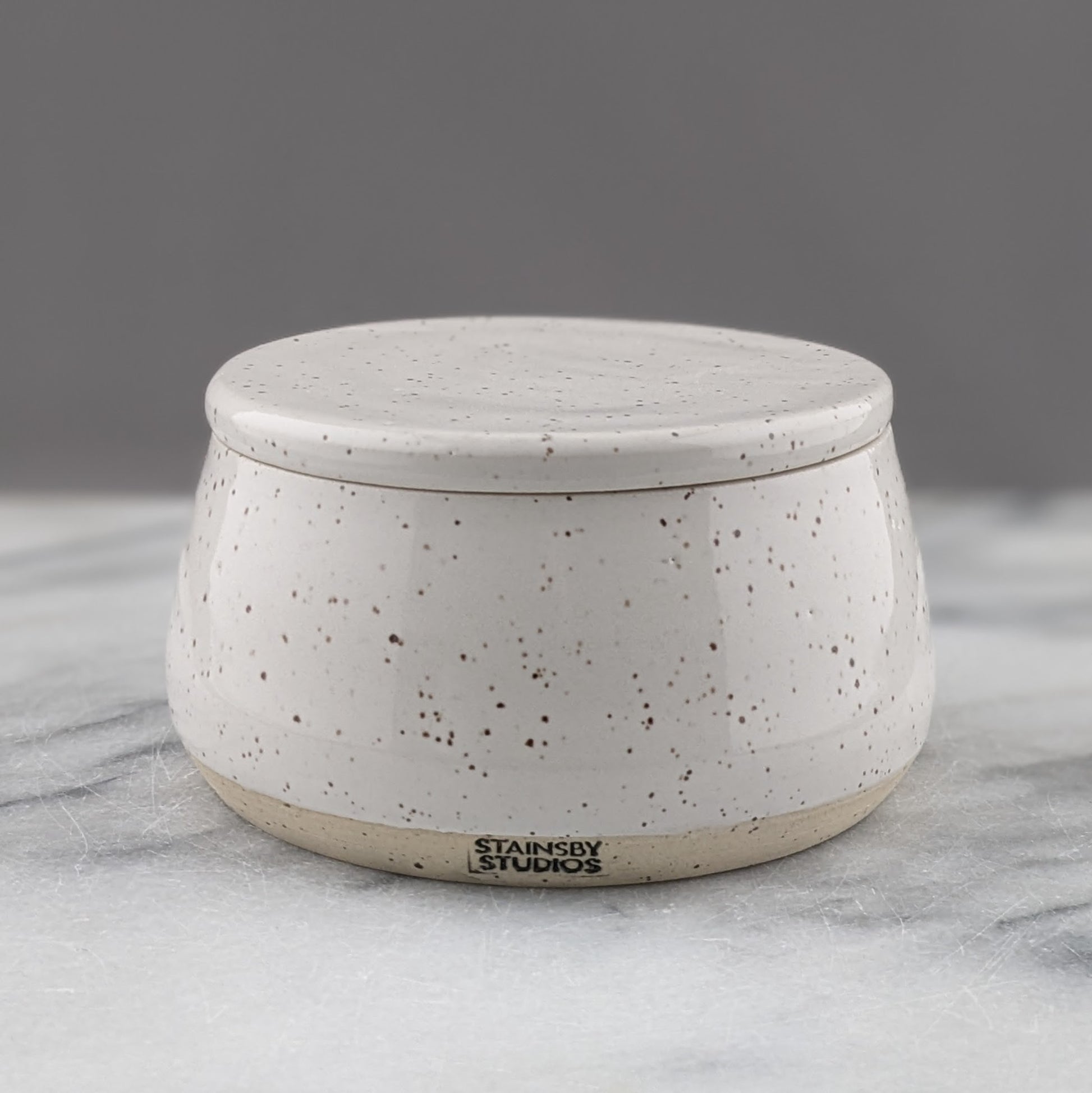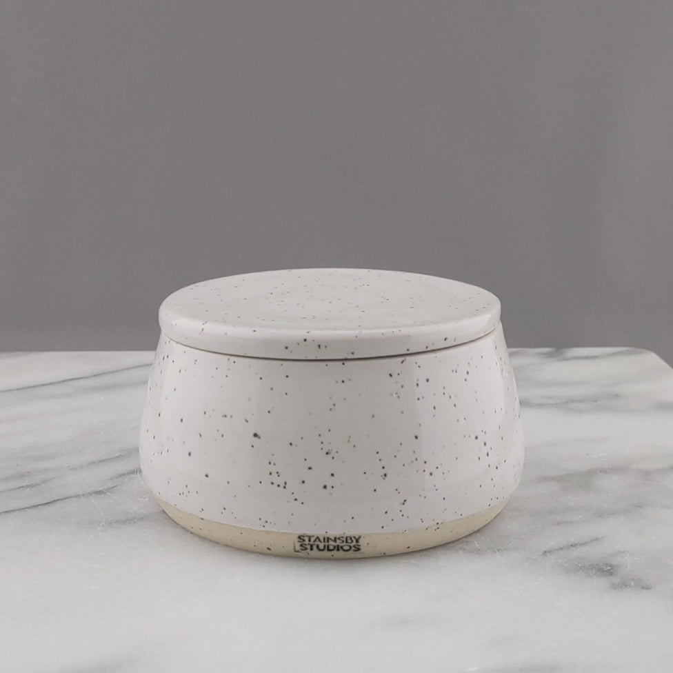 Enhance your kitchen or desk with a touch of sophistication using this exquisite white speckled ceramic jar. Crafted with a glossy glaze and safe, non-toxic materials, it's ideal for holding sugar, tea bags, or salt during culinary endeavours. Approximately 4.25 inches wide and just under 2.5 inches tall, it also makes for a thoughtful holiday present for any gourmet.