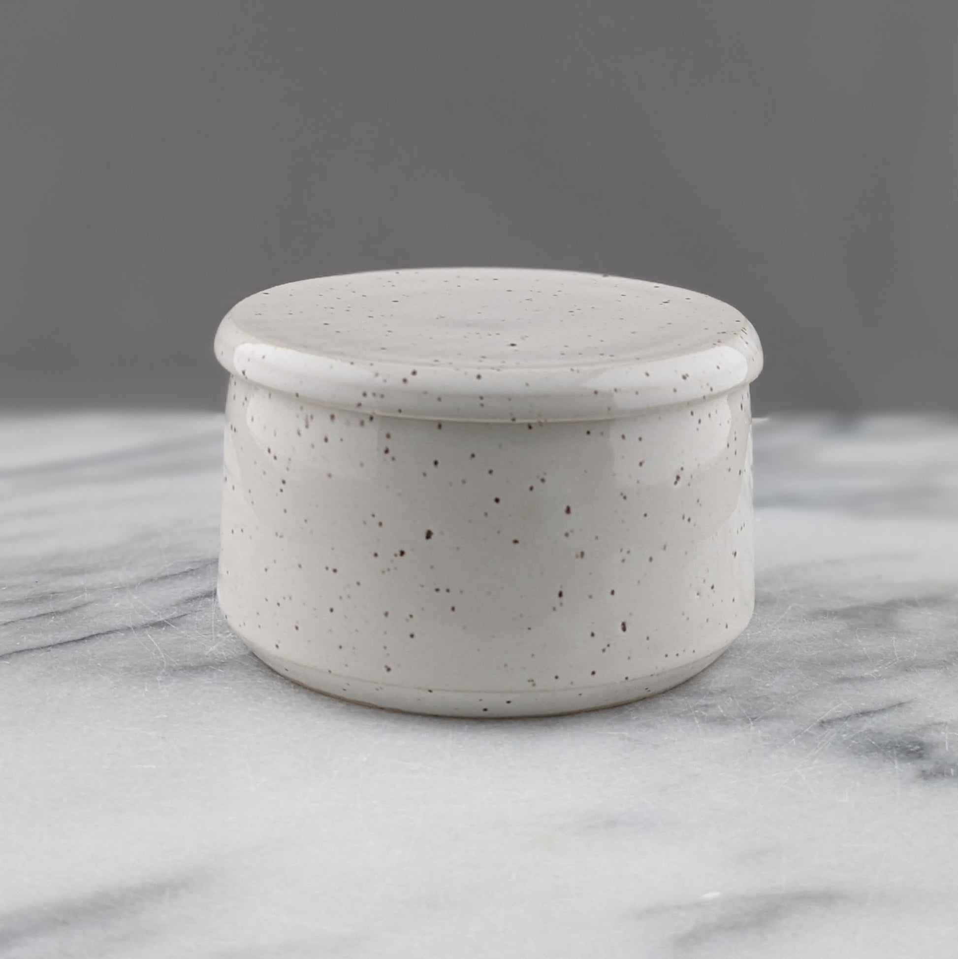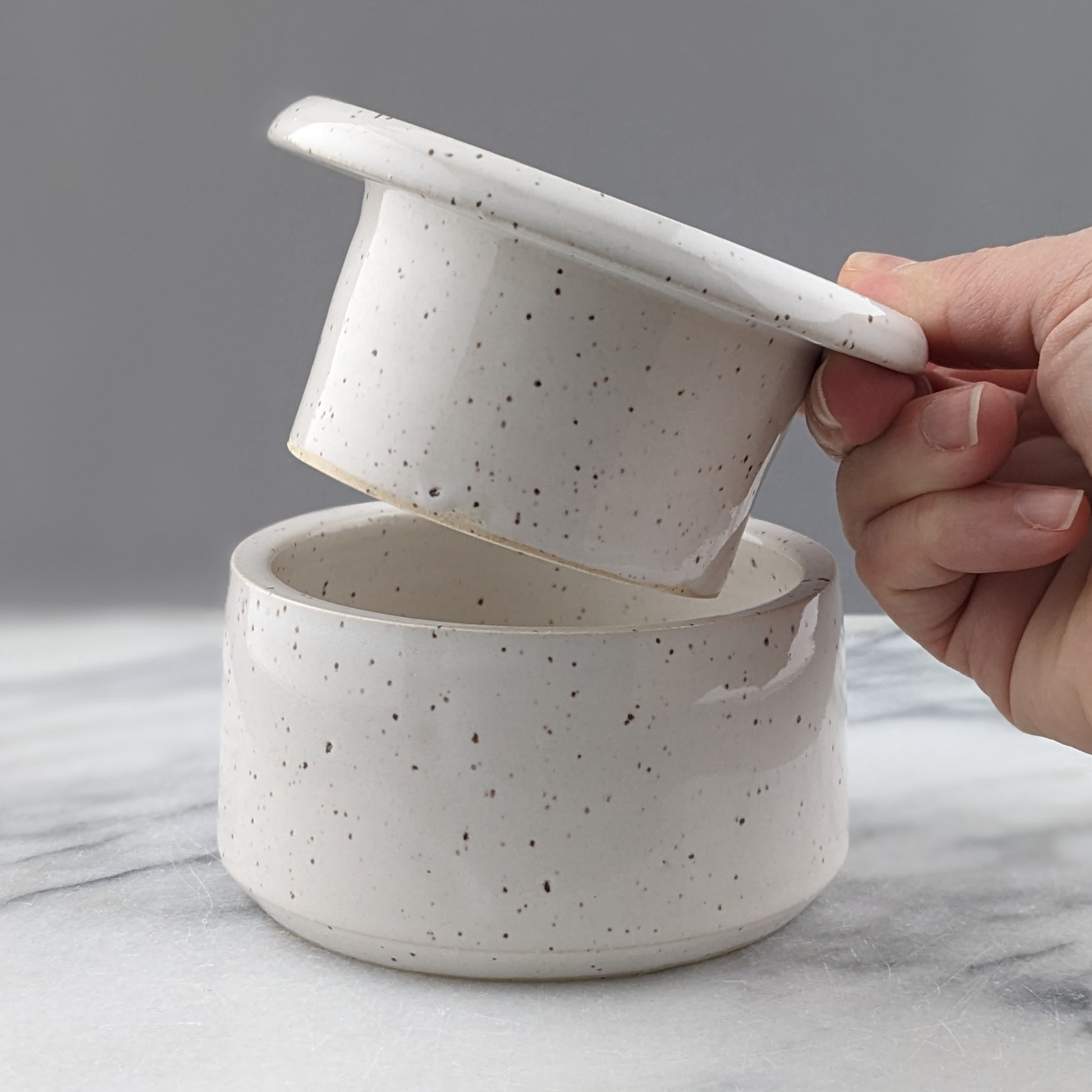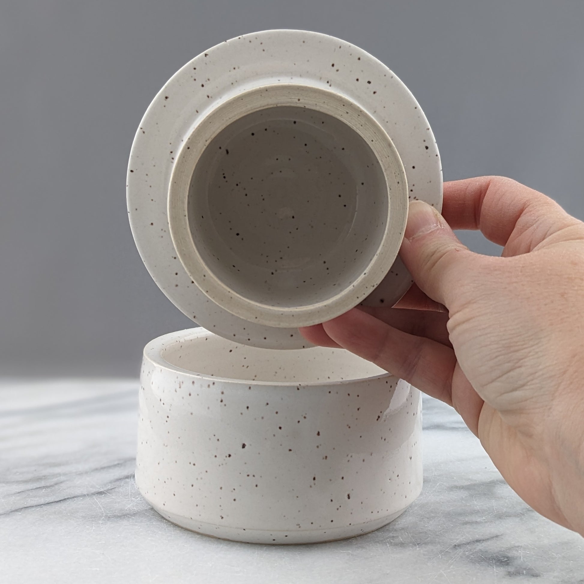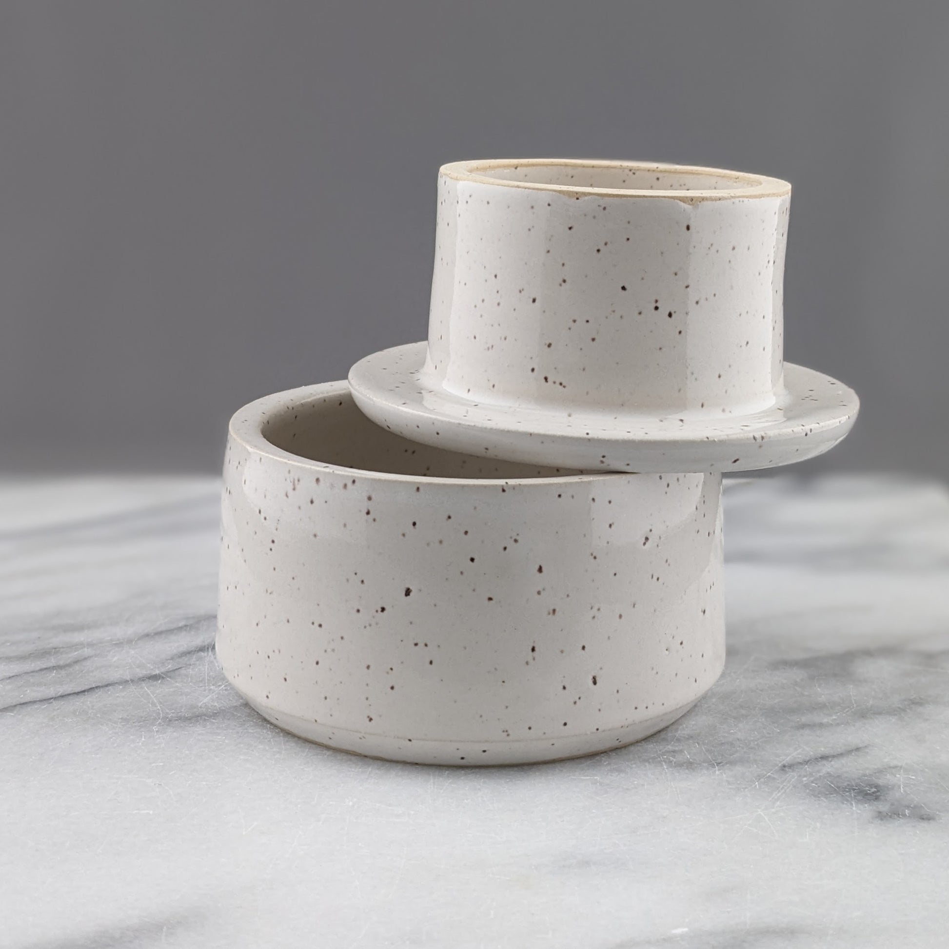 This one-of-a-kind ceramic French butter keeper is handmade from speckled clay and has a shiny white glaze. It holds approximately half a cup of butter on the counter at room temperature ready to spread. Just add water to the base to create a seal with the lid and you're good to go! Approximately 4.25 inches wide at its widest and 2.5 inches tall. This handmade butter crock is a perfect Hanukkah or Christmas gift for the bread baker or food lover in your life.
