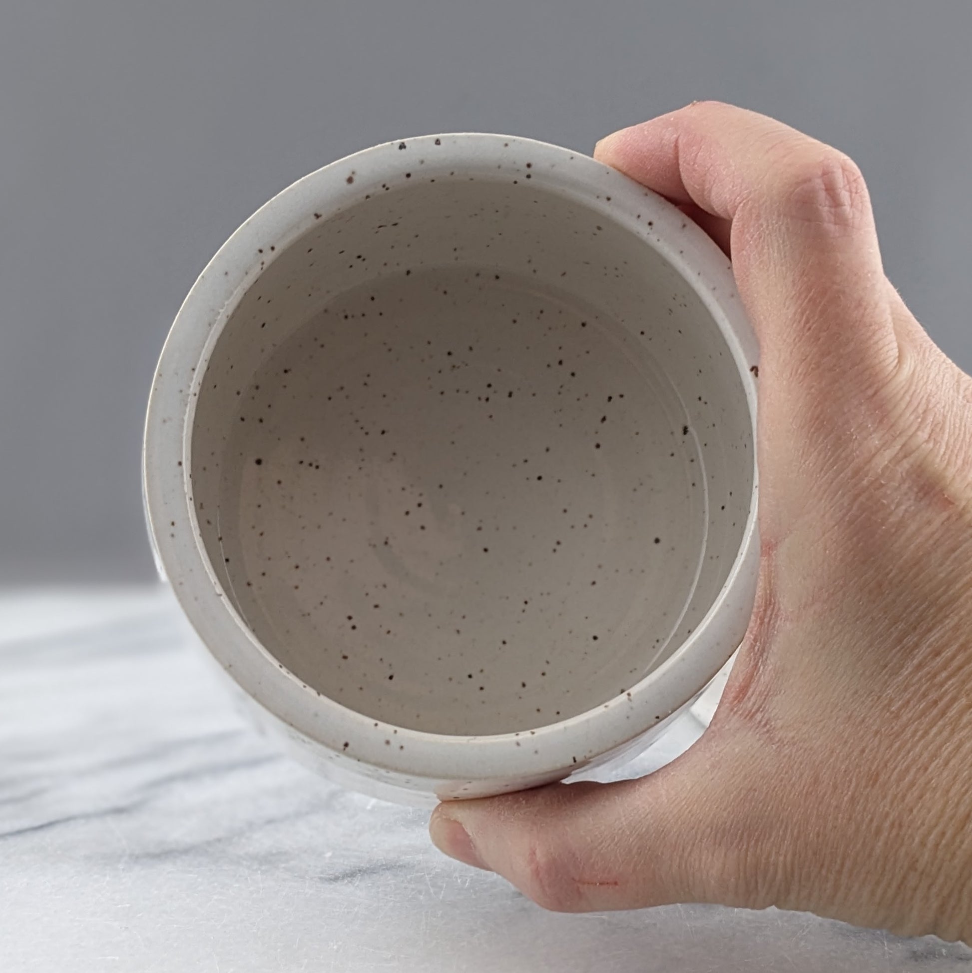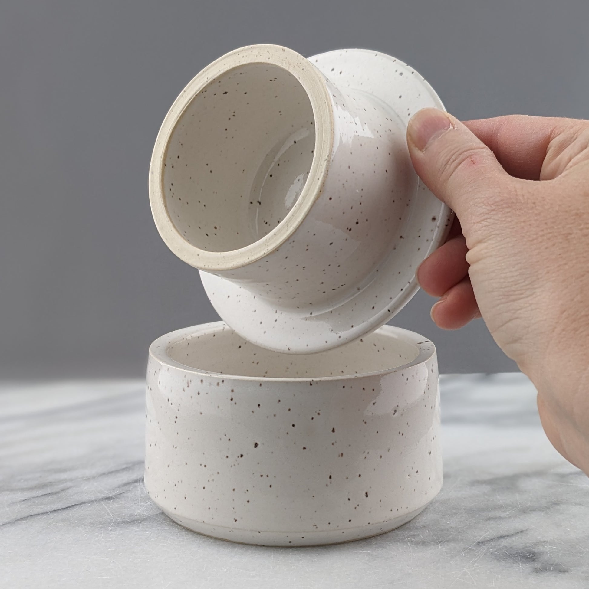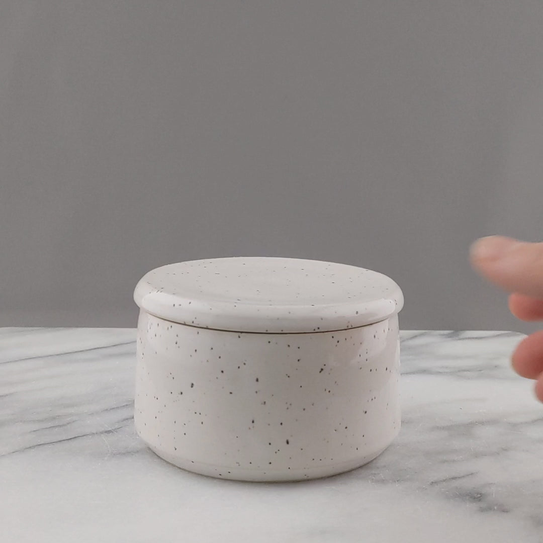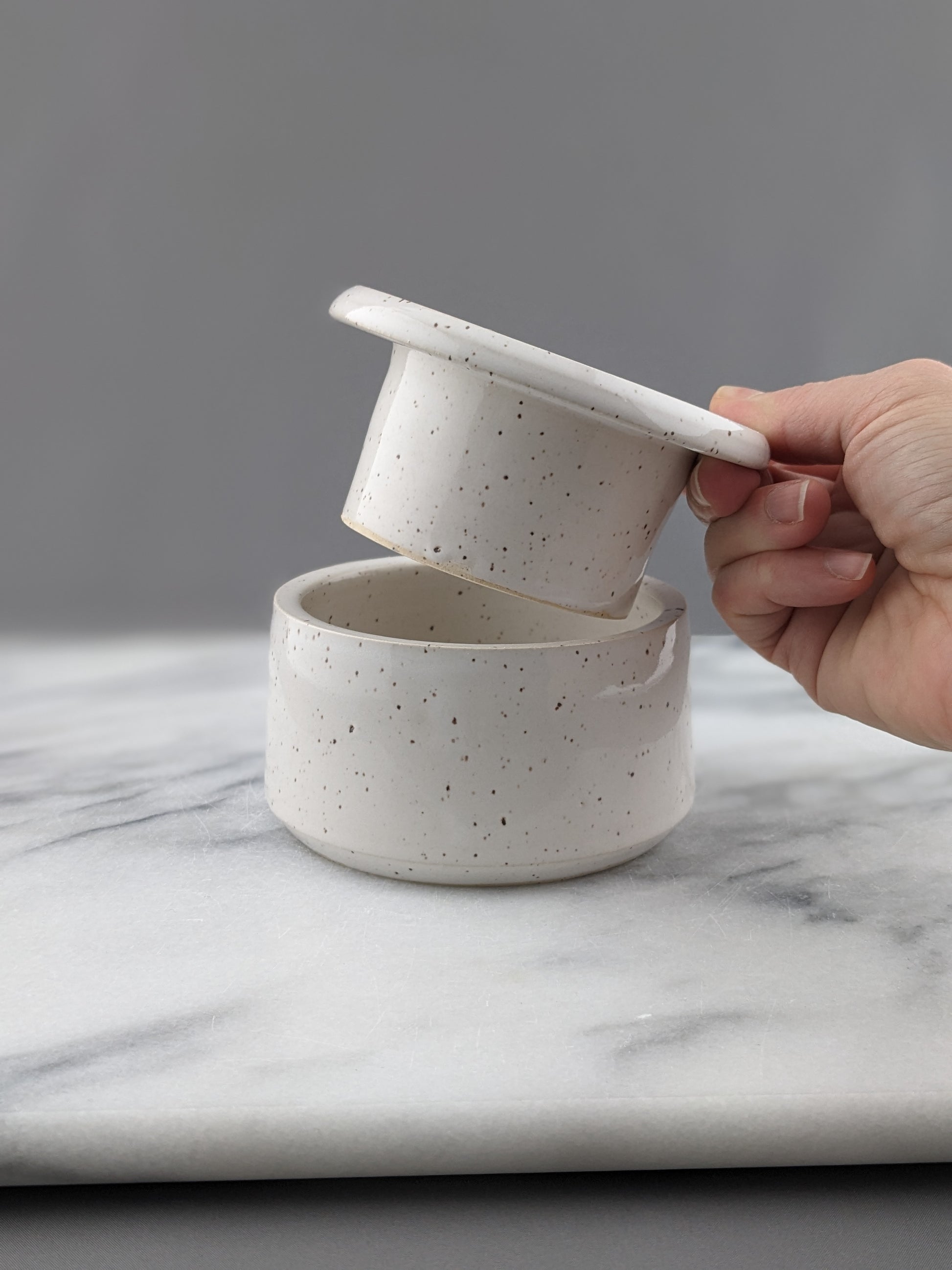 This one-of-a-kind ceramic French butter keeper is handmade from speckled clay and has a shiny white glaze. It holds approximately half a cup of butter on the counter at room temperature ready to spread. Just add water to the base to create a seal with the lid and you're good to go! Approximately 4.25 inches wide at its widest and 2.5 inches tall. This handmade butter crock is a perfect Hanukkah or Christmas gift for the bread baker or food lover in your life.