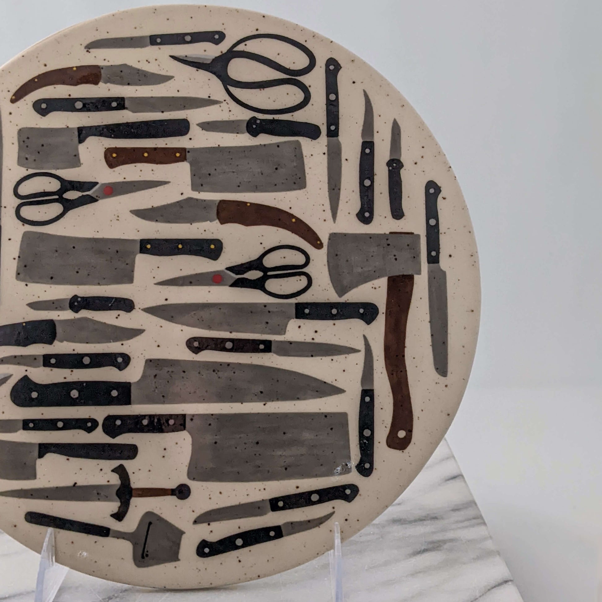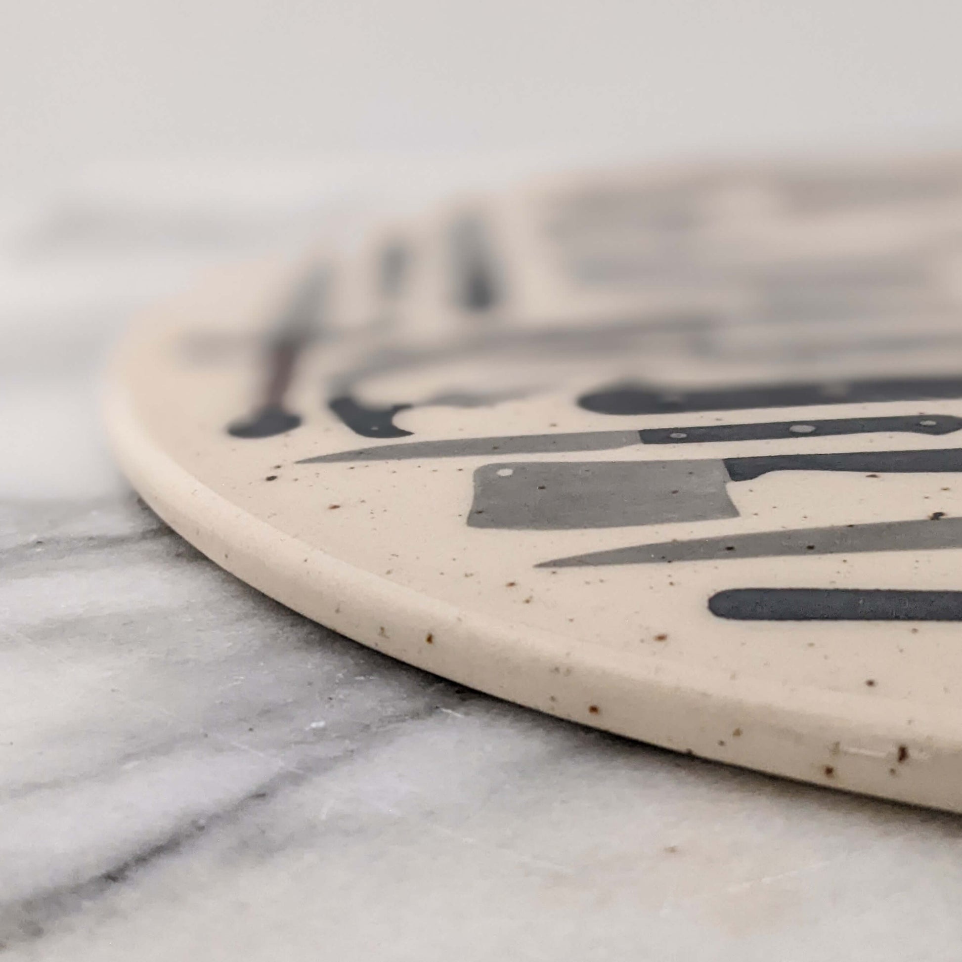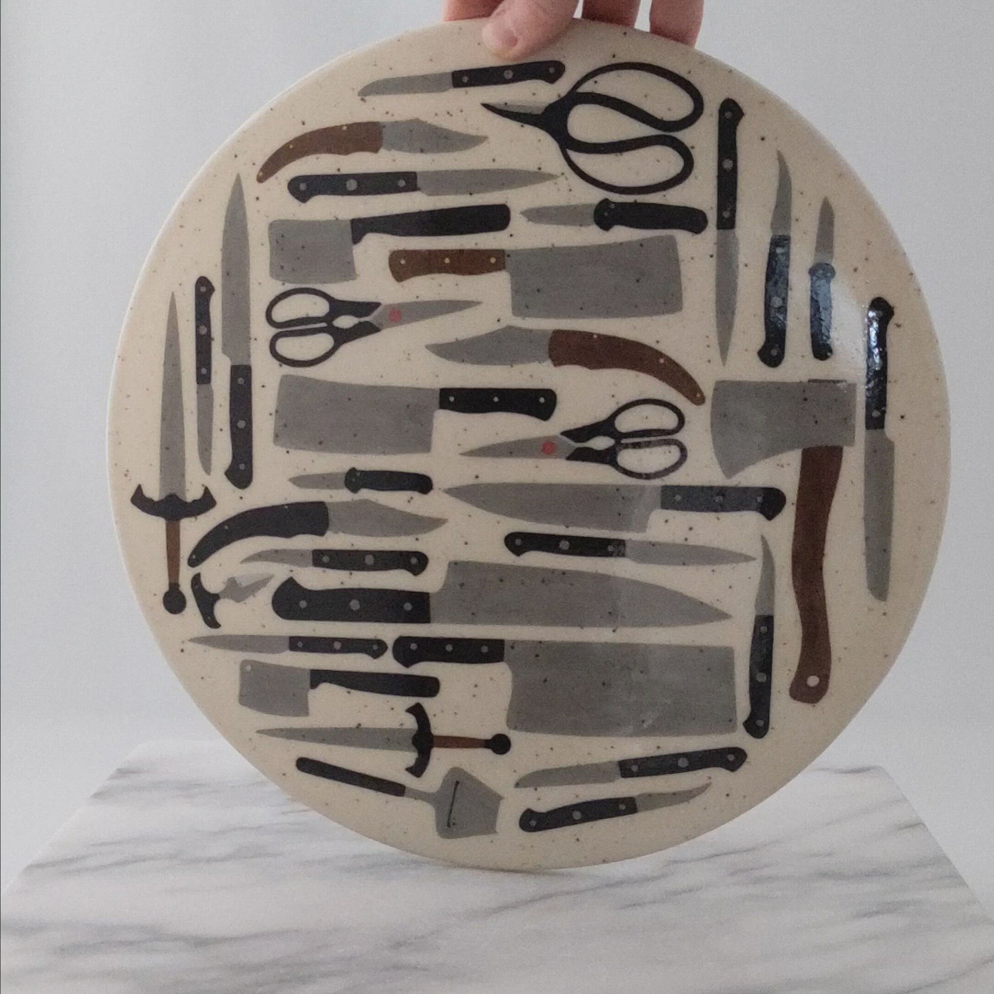 This handmade and hand painted ceramic platter is as durable and functional as it is striking. It is designed to be used with cheese or charcuterie or can enliven and contain a collection of pretty and useful things. This unique design makes a special statement about finding beauty in utility with a sharp hint of danger.