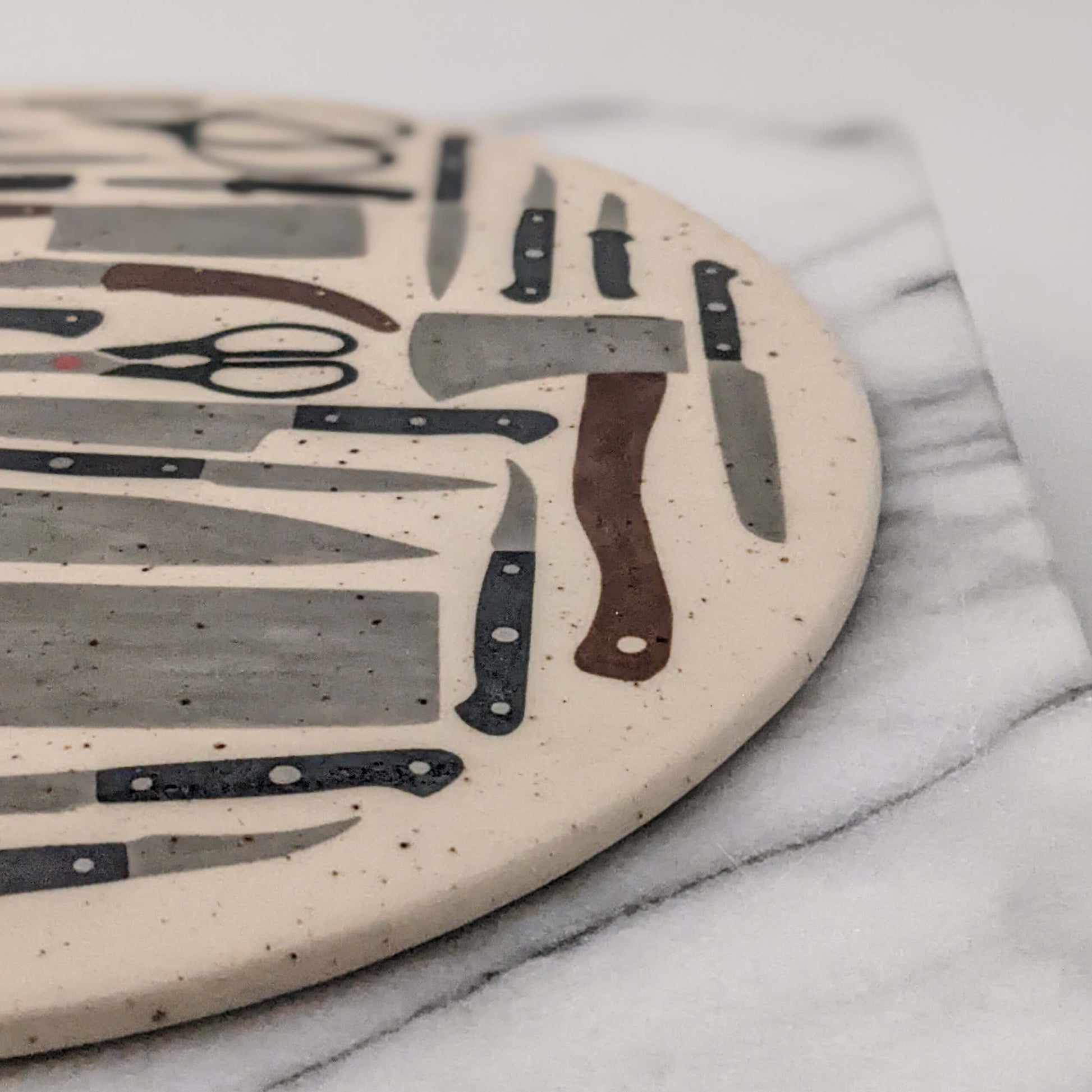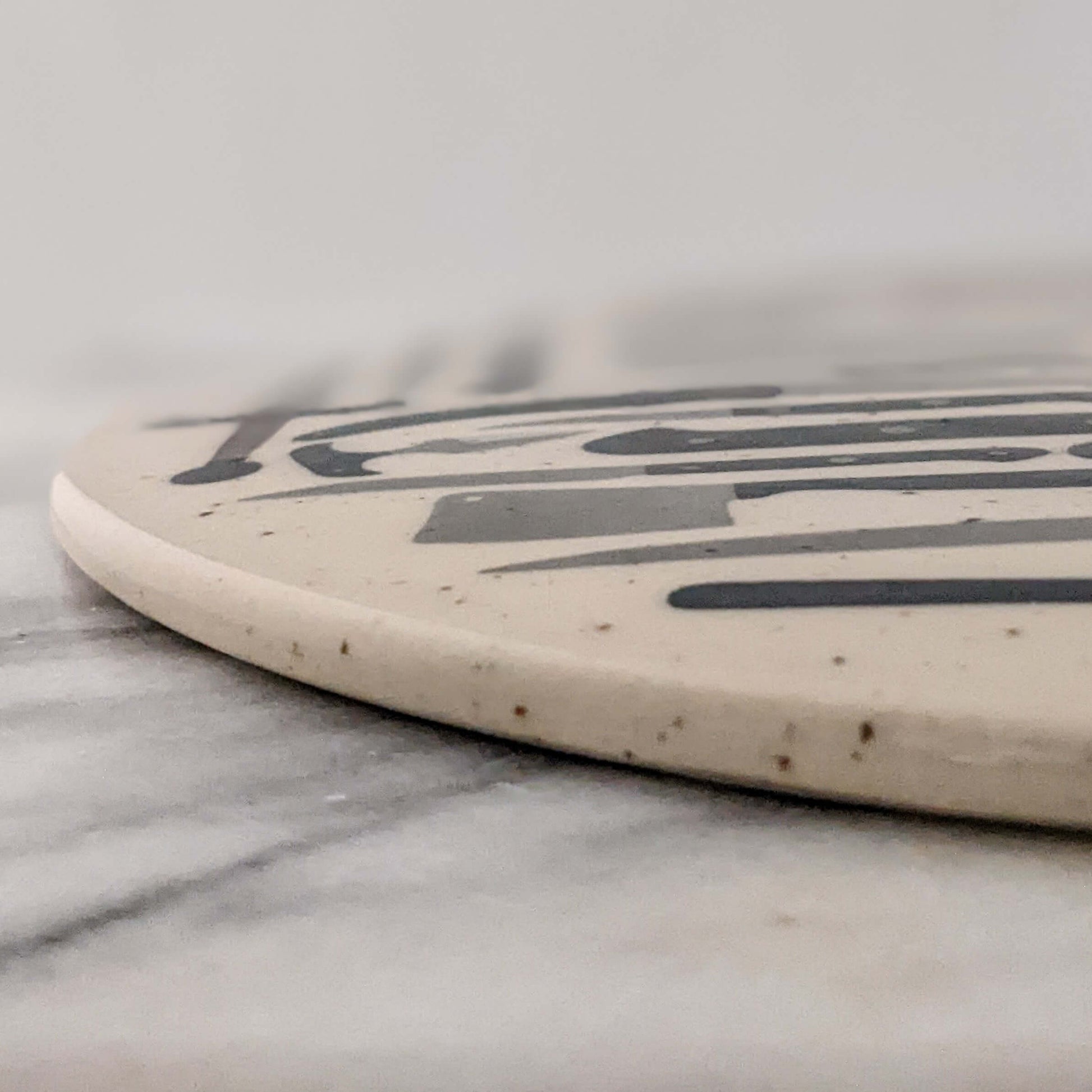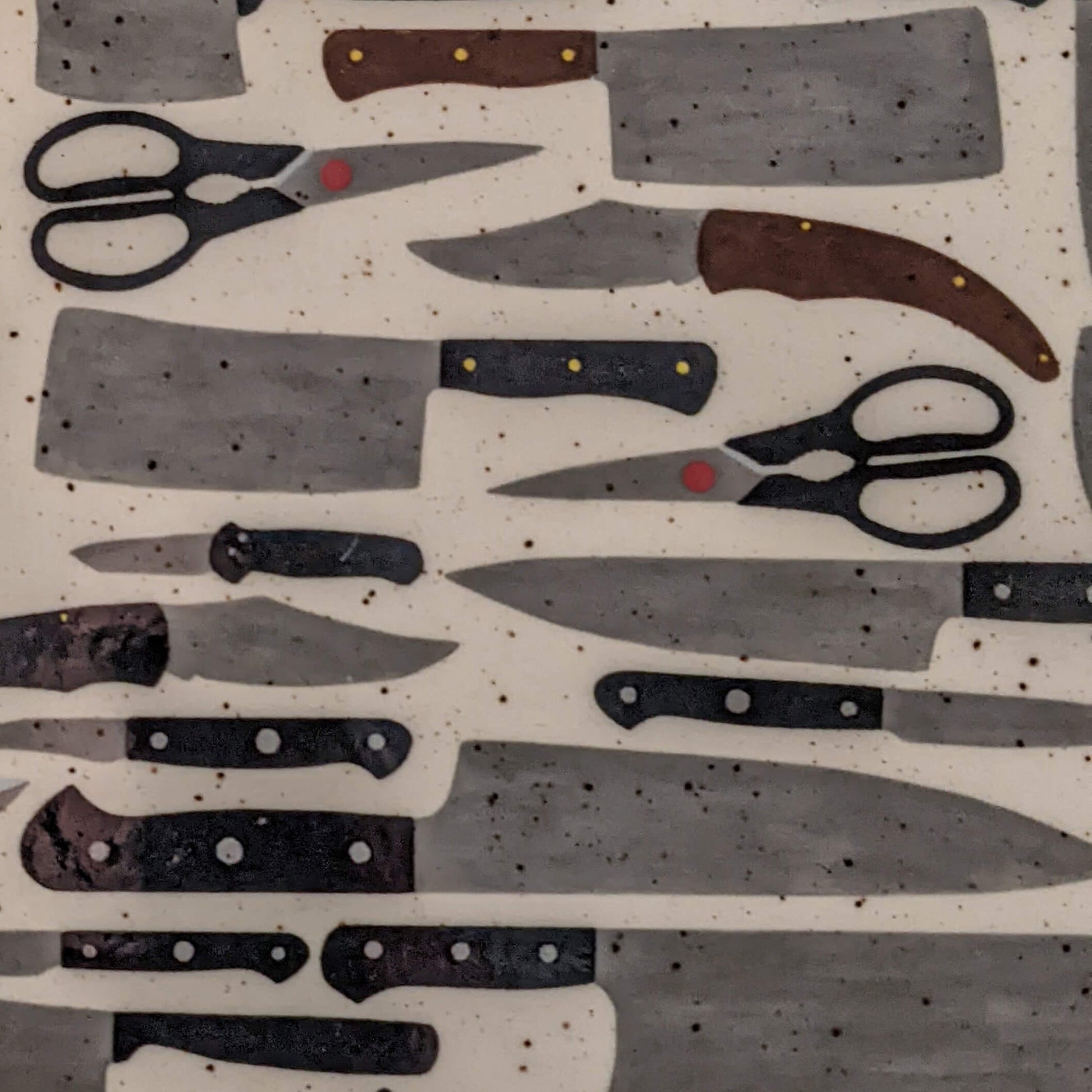 This handmade and hand painted ceramic platter is as durable and functional as it is striking. It is designed to be used with cheese or charcuterie or can enliven and contain a collection of pretty and useful things. This unique design makes a special statement about finding beauty in utility with a sharp hint of danger.
