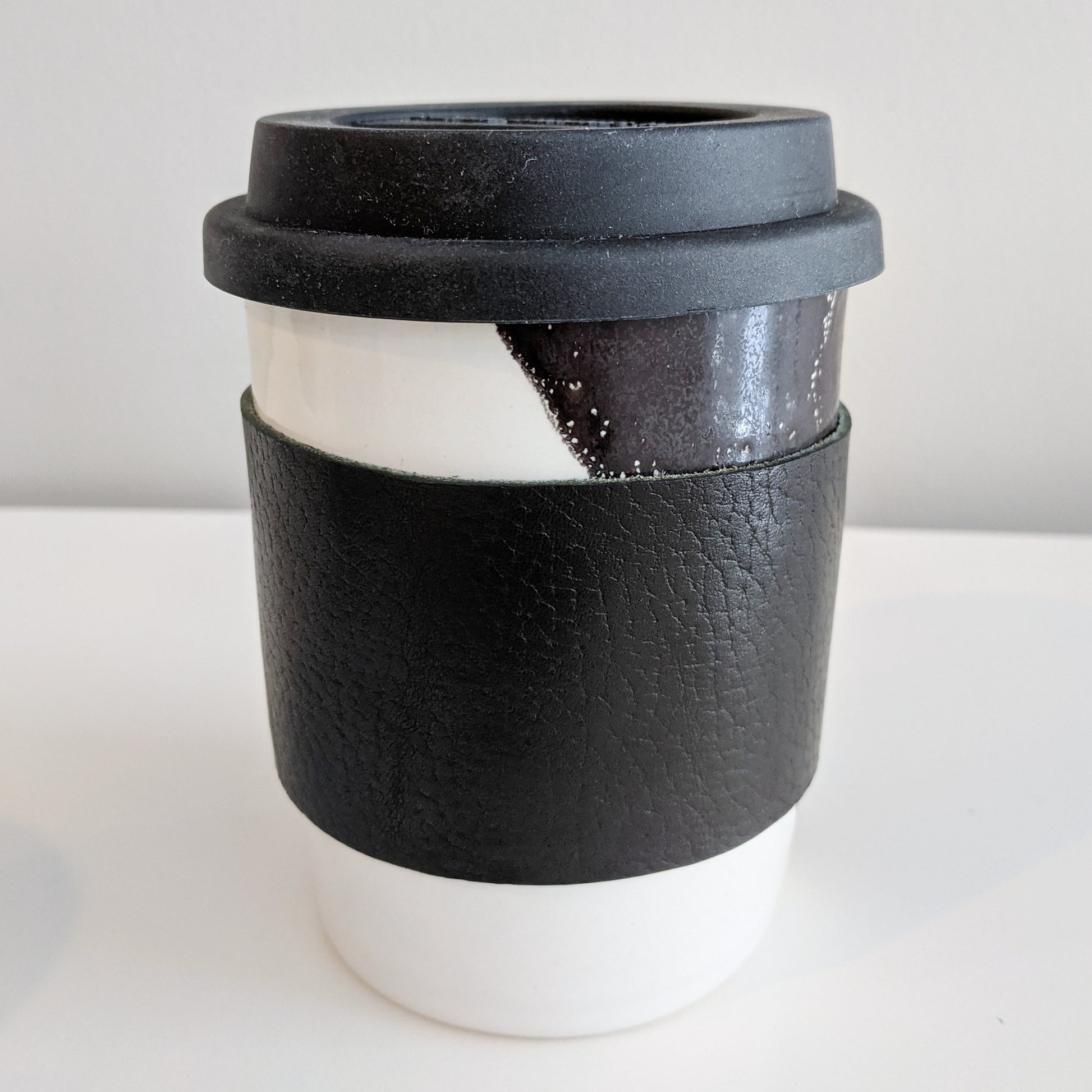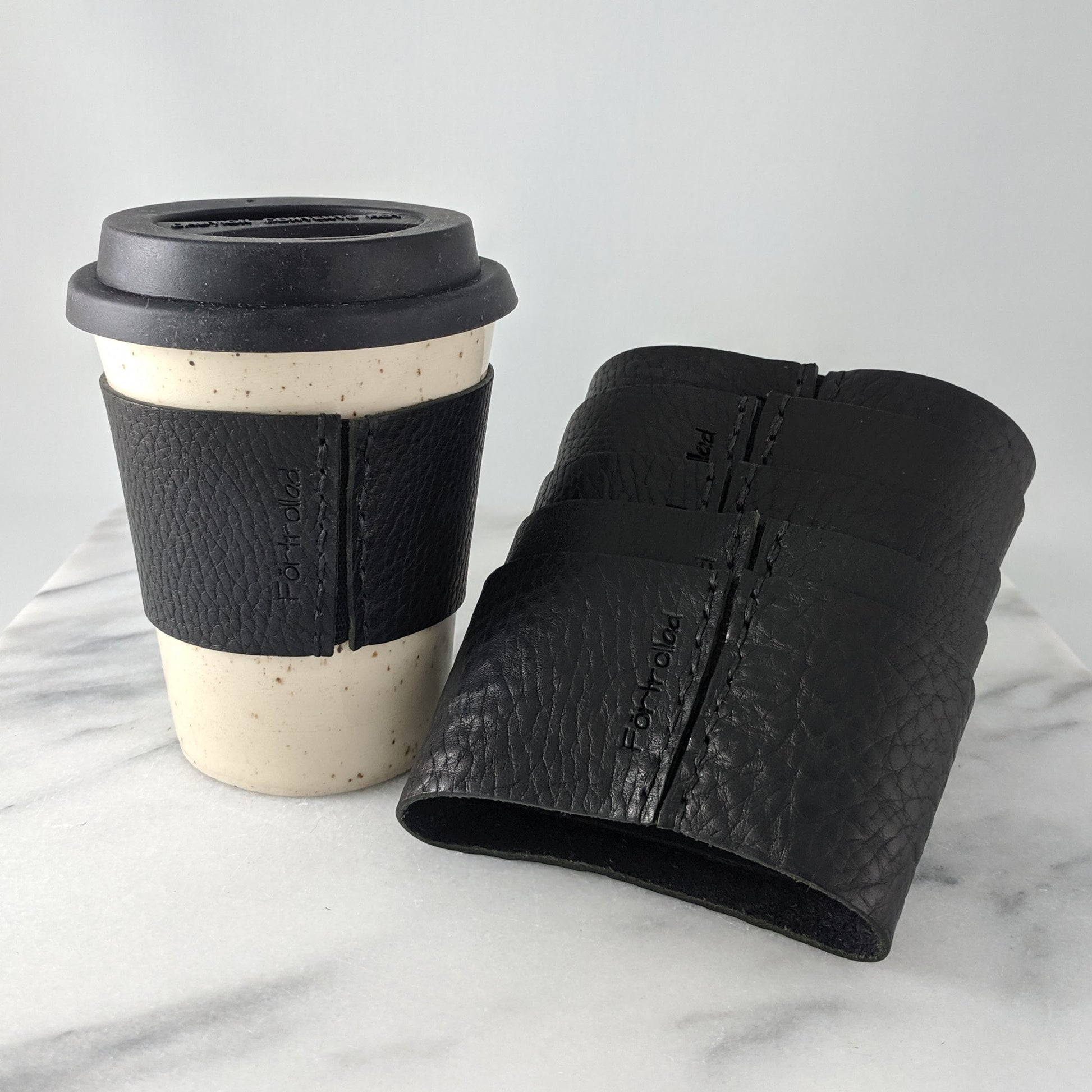This high quality leather sleeve was designed to fit most coffee cups including our ceramic travel mugs and tumblers. The leather is hand sewn with an elastic seam and can adjust for a perfect fit. The leather sleeve is available in black and has a beautiful grain pattern. Grain pattern varies from piece to piece with some pronounced and others with a subtle, smoother look.