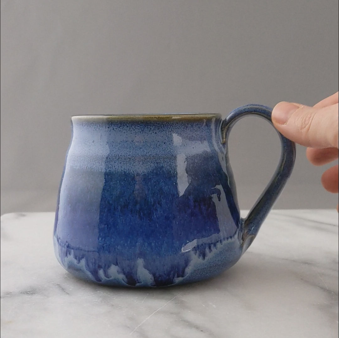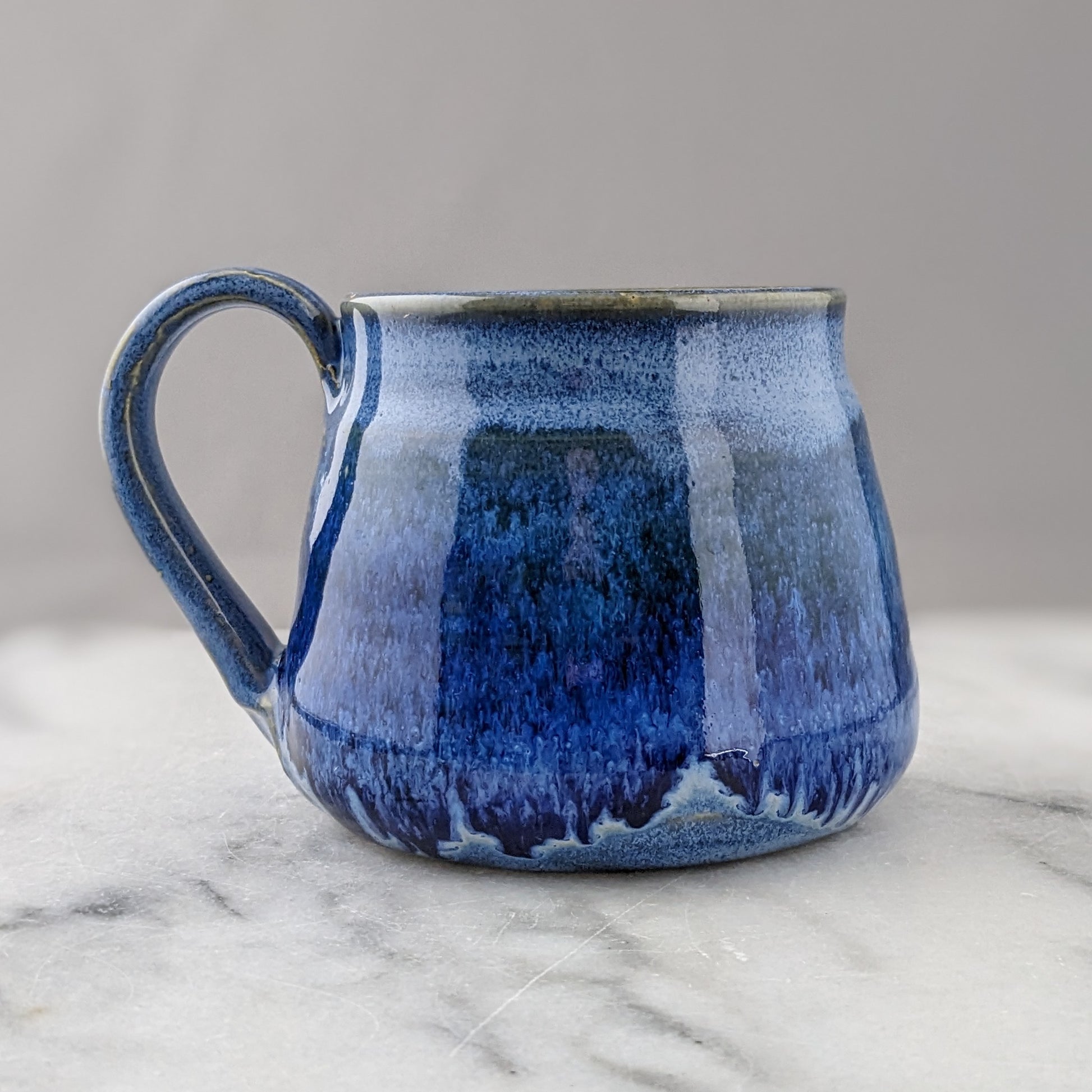 Indulge in the unique beauty of our One of a Kind Blue Ceramic Mug. Its organic blue glaze showcases the glass of the glaze melting over the mug from the heat of the kiln. Experience the luxury of owning a truly exclusive piece. Sip your coffee or tea in style with this handcrafted masterpiece.