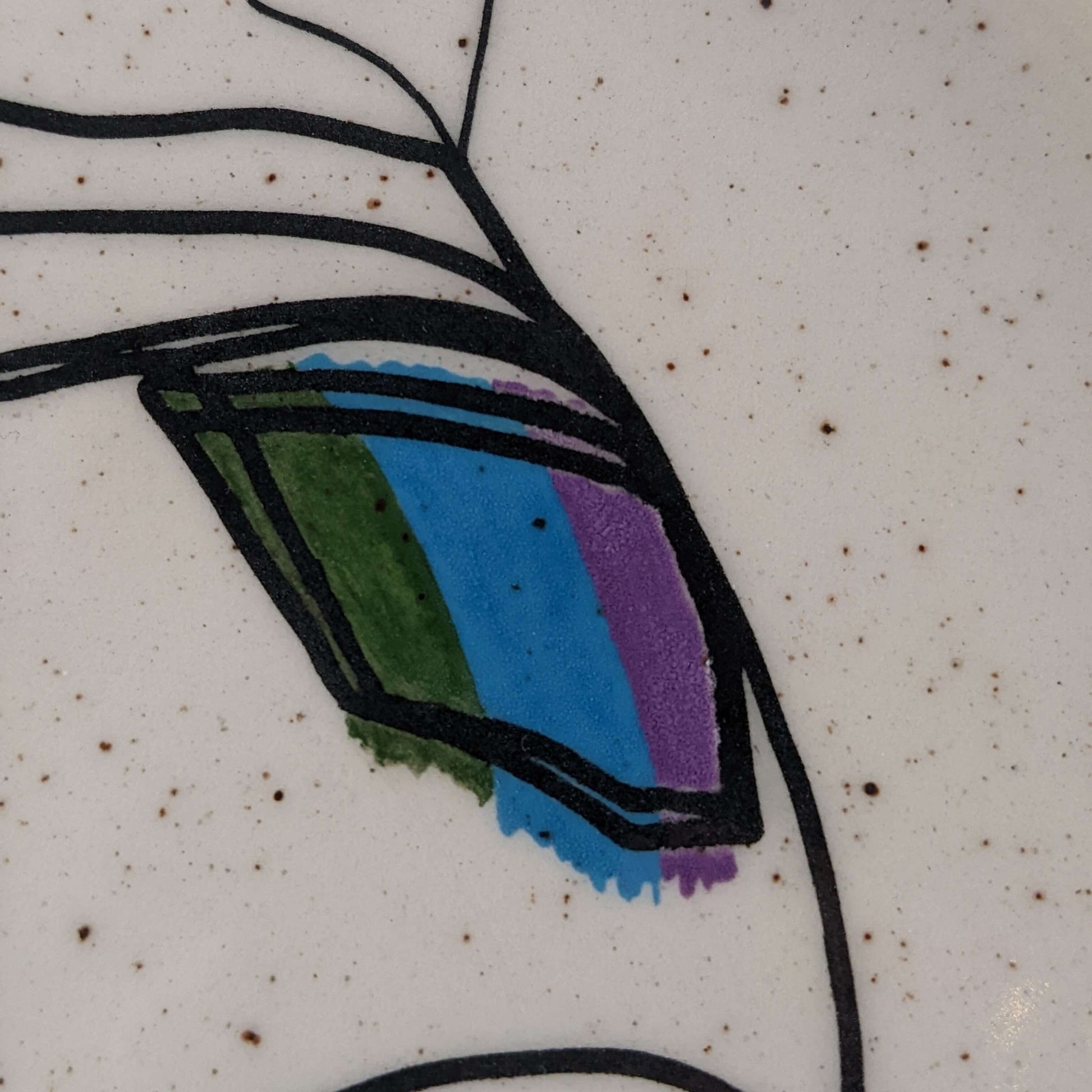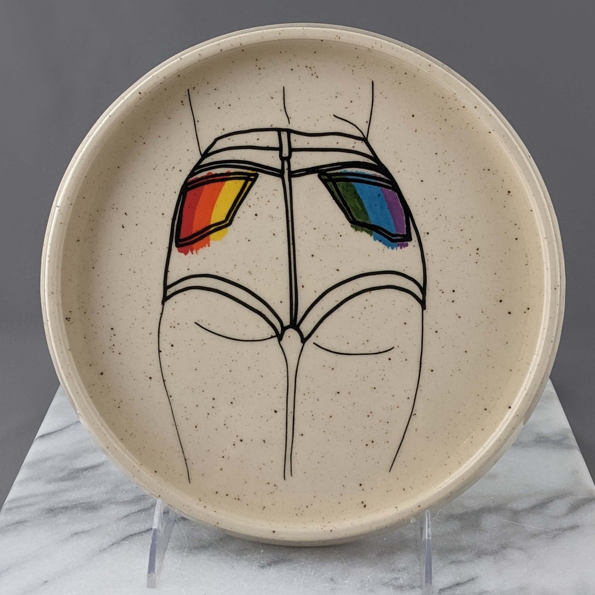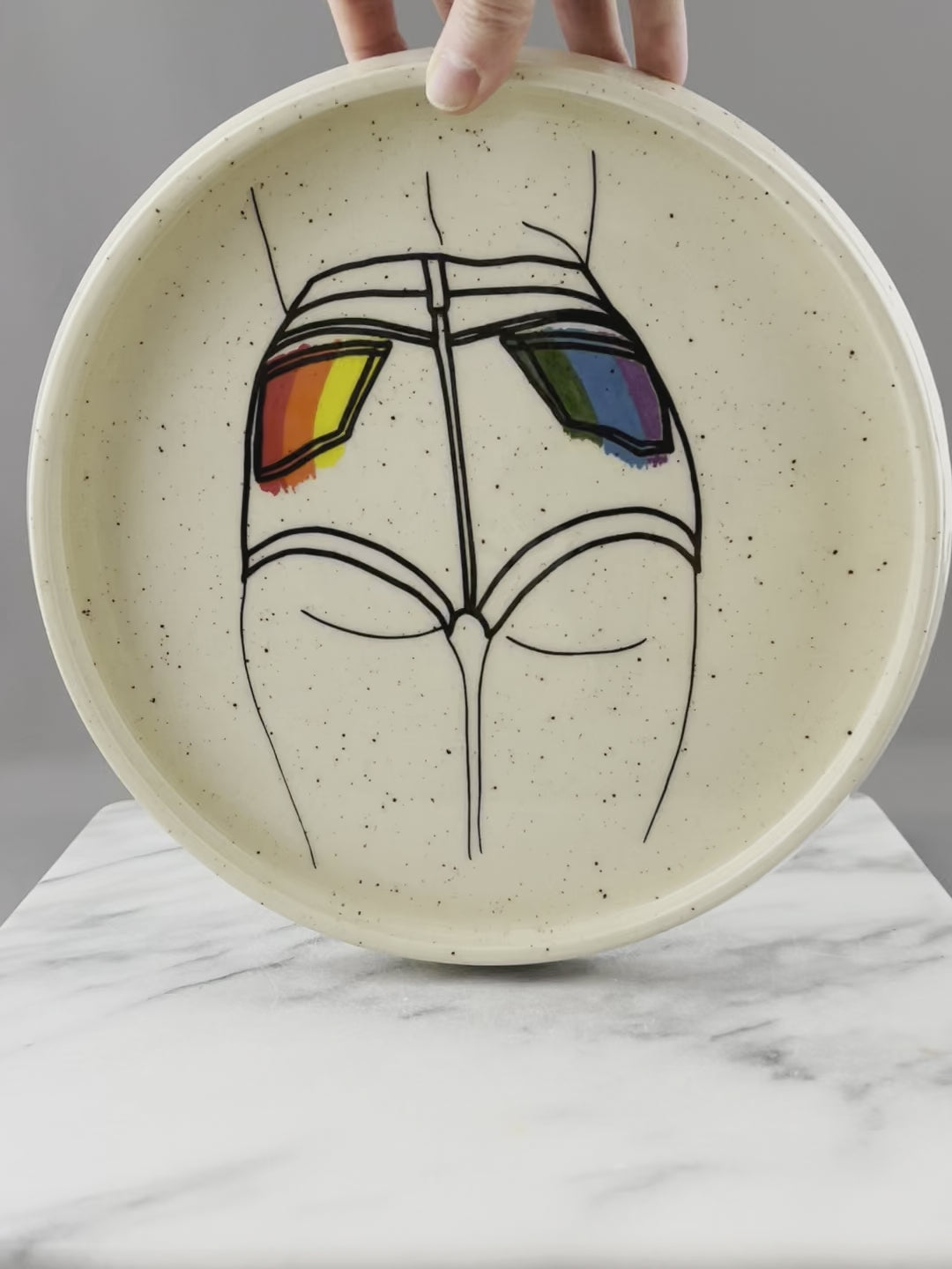 I just love a great pair of jean shorts. Every summer I end up wearing my favourite and, if they wear out before I'm done with them, I quietly mourn my loss. This handmade ceramic tray has a line drawing of a woman wearing a cute pair of short shorts with a LGBTQ rainbow flag design on the pockets. This stunning piece is as functional as it is beautiful: sturdy speckled stoneware is dishwasher, microwave and oven safe. And like all Stainsby Studios products it's made with non-toxic, lead-free, food-safe glazes. This platter is a perfect landing pad for keys and sunglasses by the door and it's equally at home serving charcuterie & cheese platter to your awesome friends. It also makes a unique and special gift for those hard-to-shop-for friends.