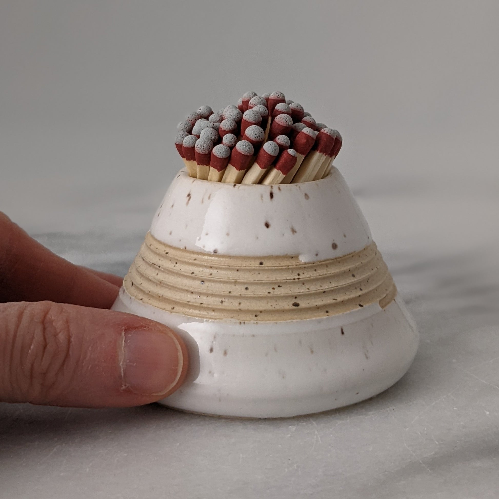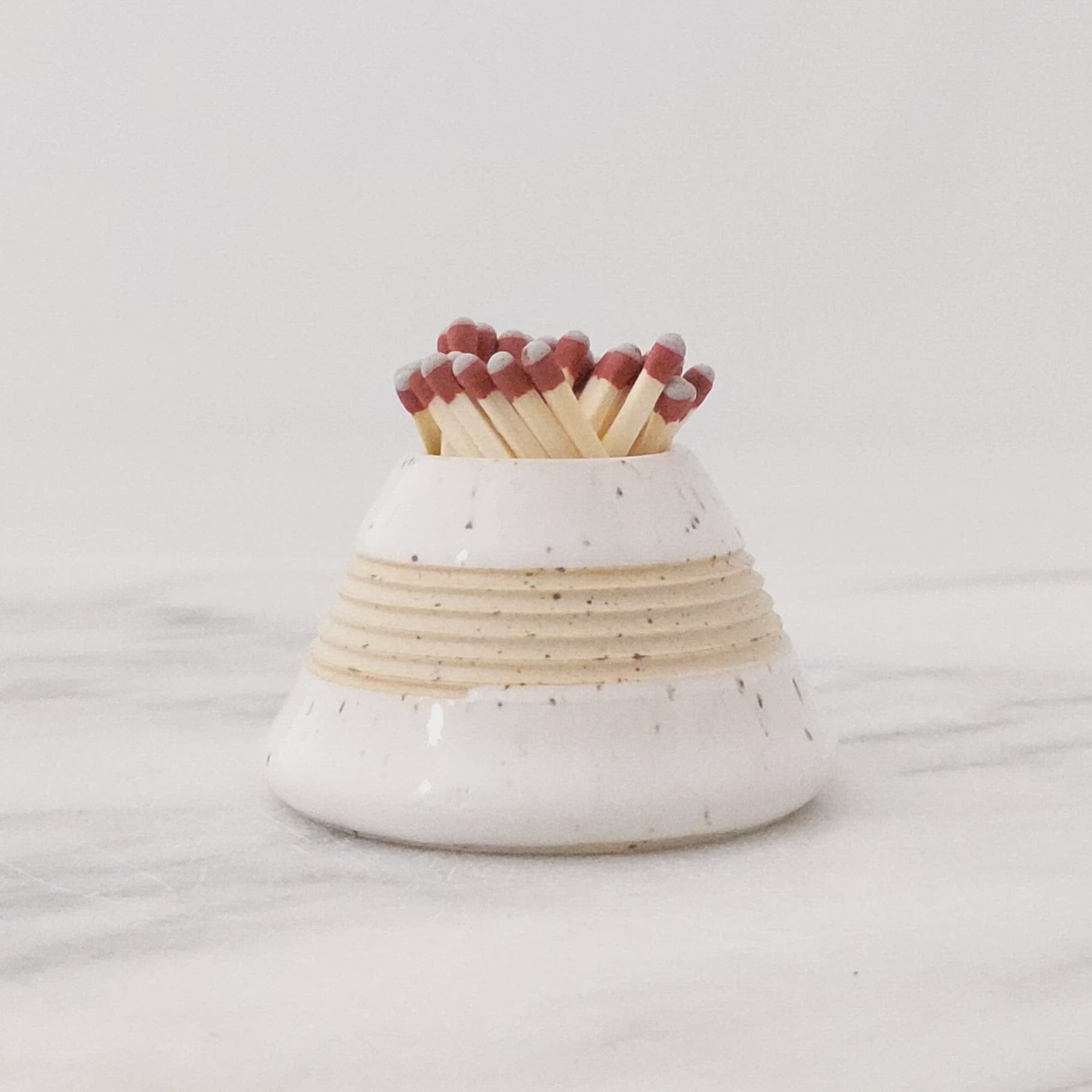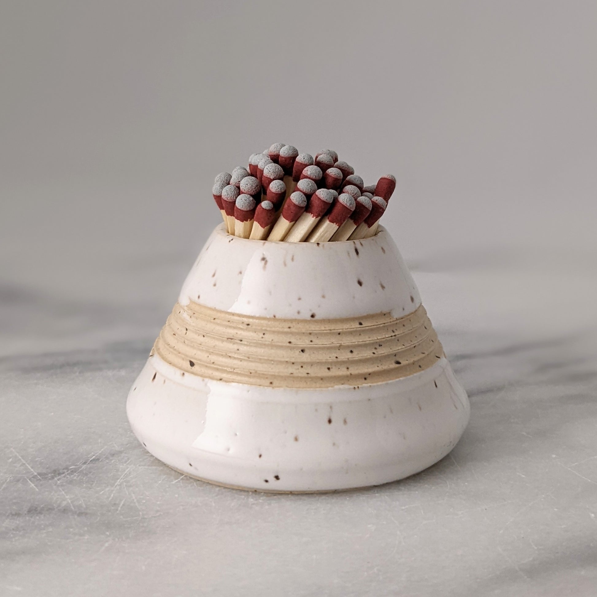 Handmade ceramic match striker in speckled white as seen in Chatelaine magazine's 2021 Made-in-Canada Gift Guide. Quickly pull grey-tipped strike anywhere matches along the ridges to light or light a regular match using the match striking paper on the base. Match strikers are wrapped in white tissue and packaged in a simple and lovely brown paper box.