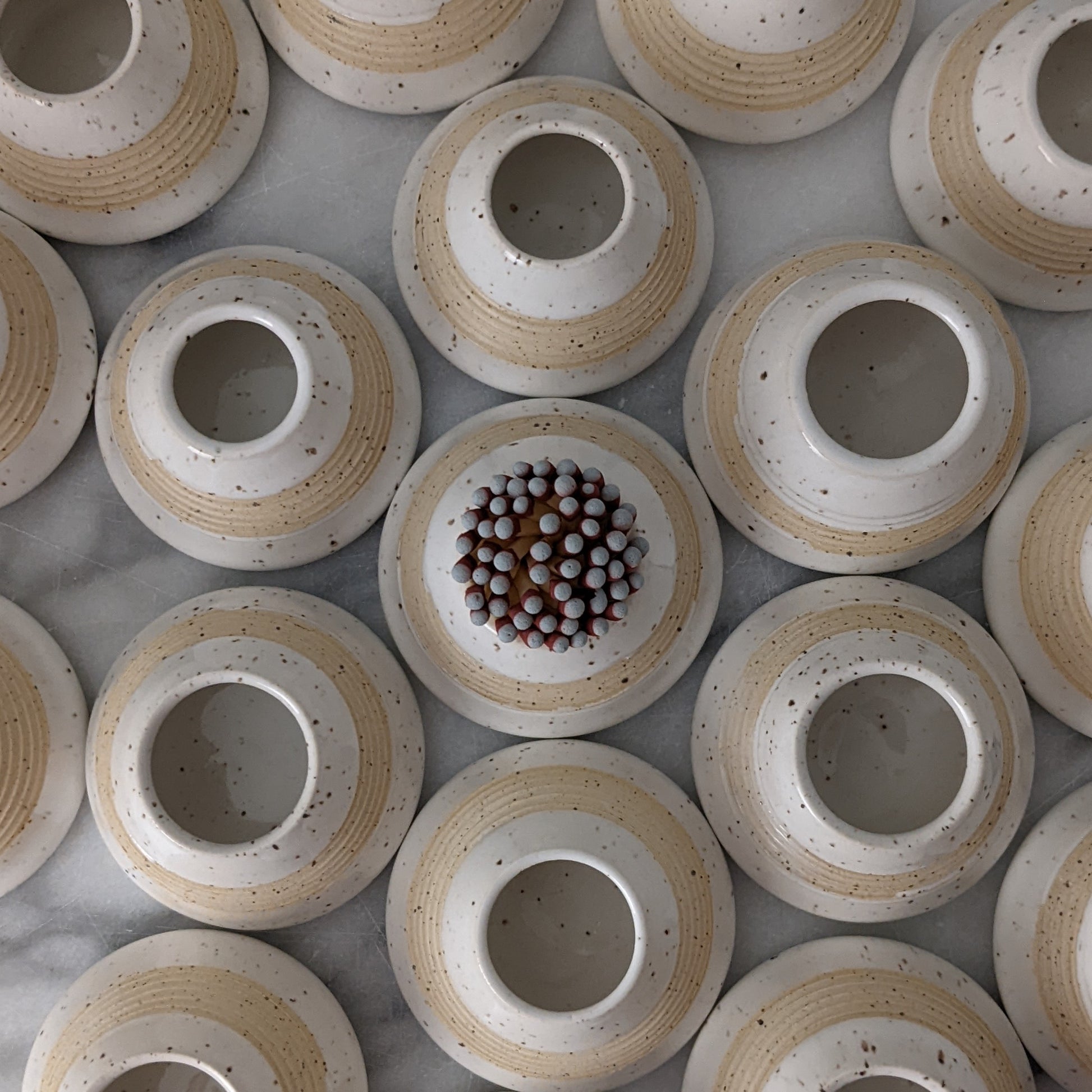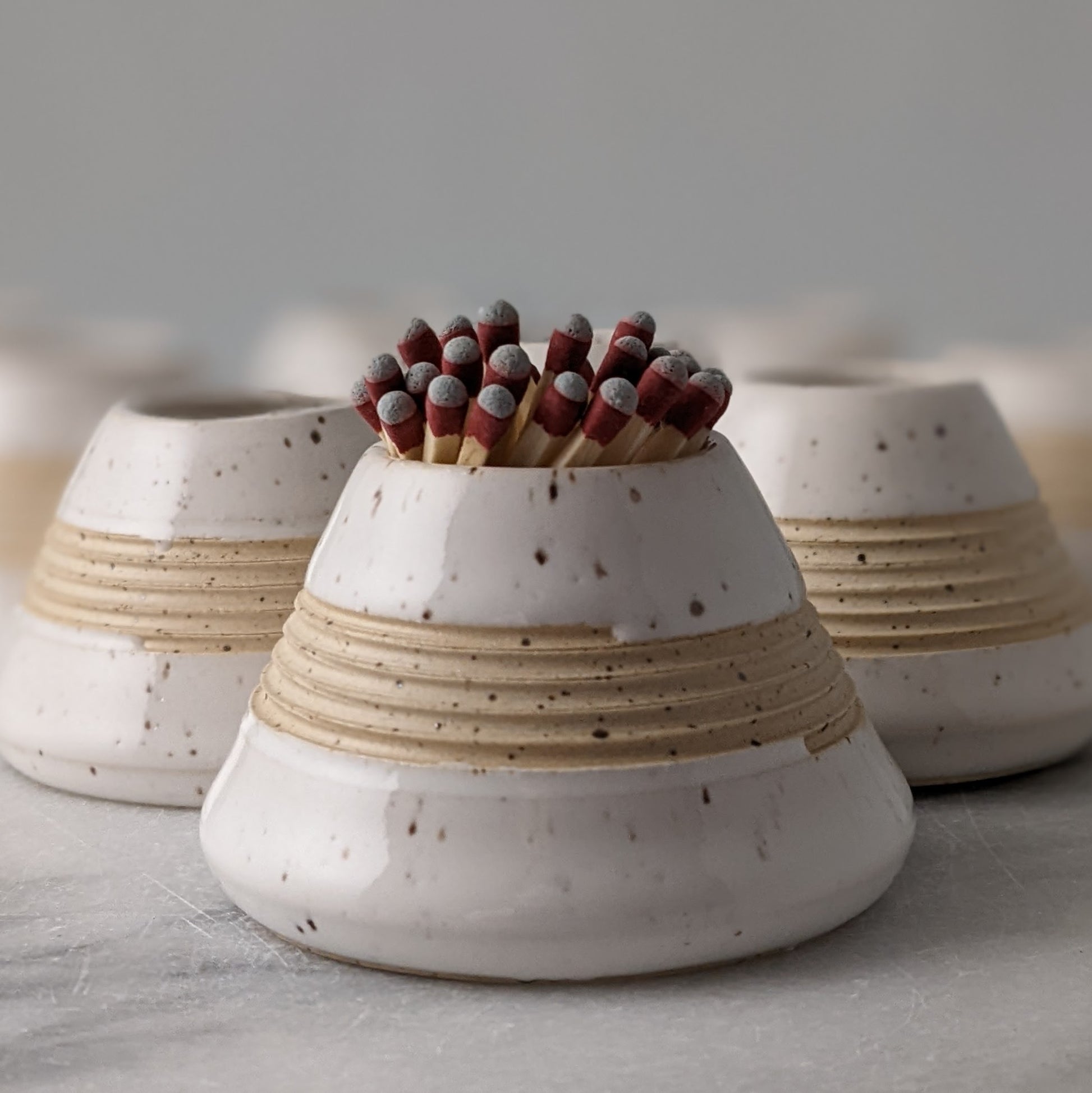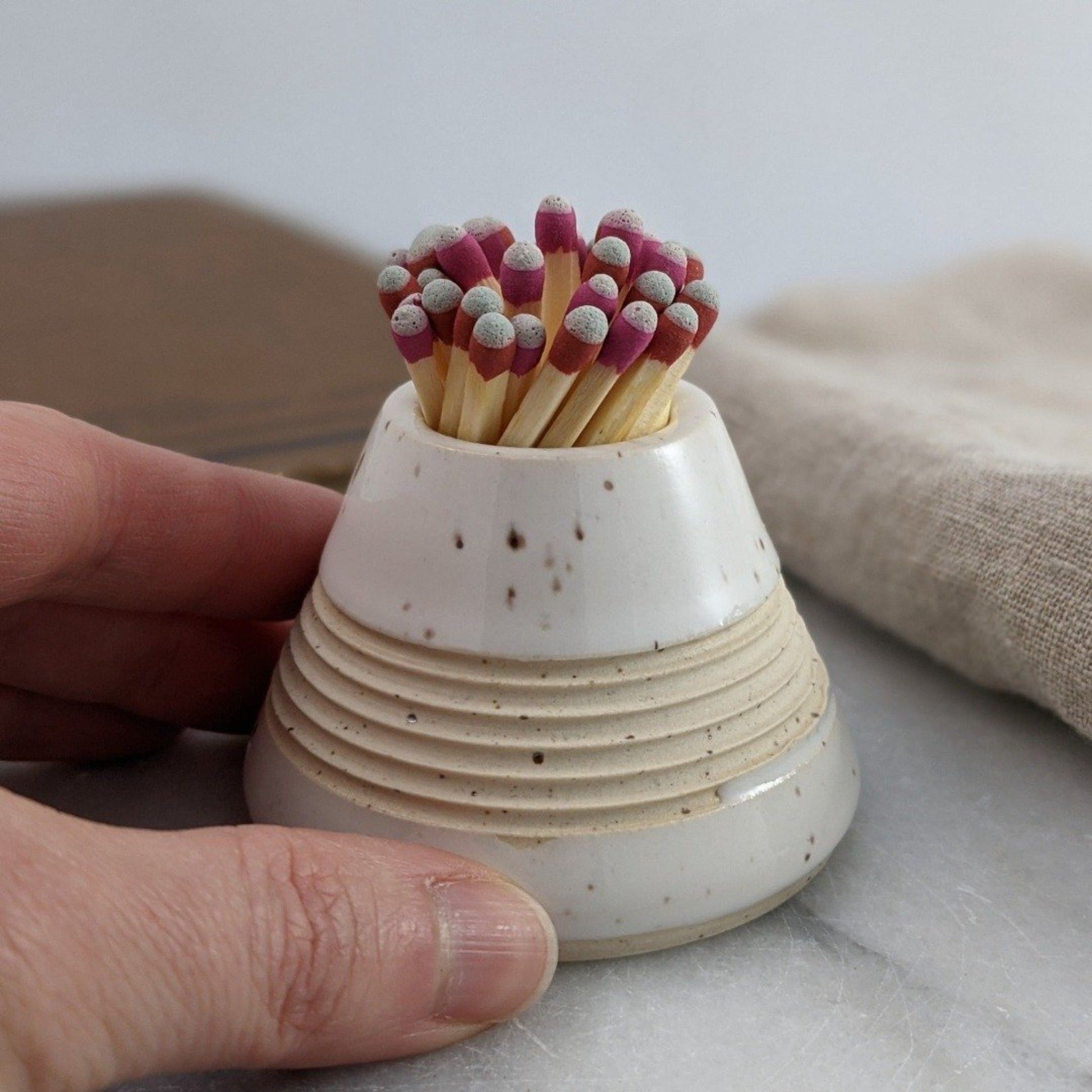 Handmade ceramic match striker in speckled white as seen in Chatelaine magazine's 2021 Made-in-Canada Gift Guide. Quickly pull grey-tipped strike anywhere matches along the ridges to light or light a regular match using the match striking paper on the base. Match strikers are wrapped in white tissue and packaged in a simple and lovely brown paper box.