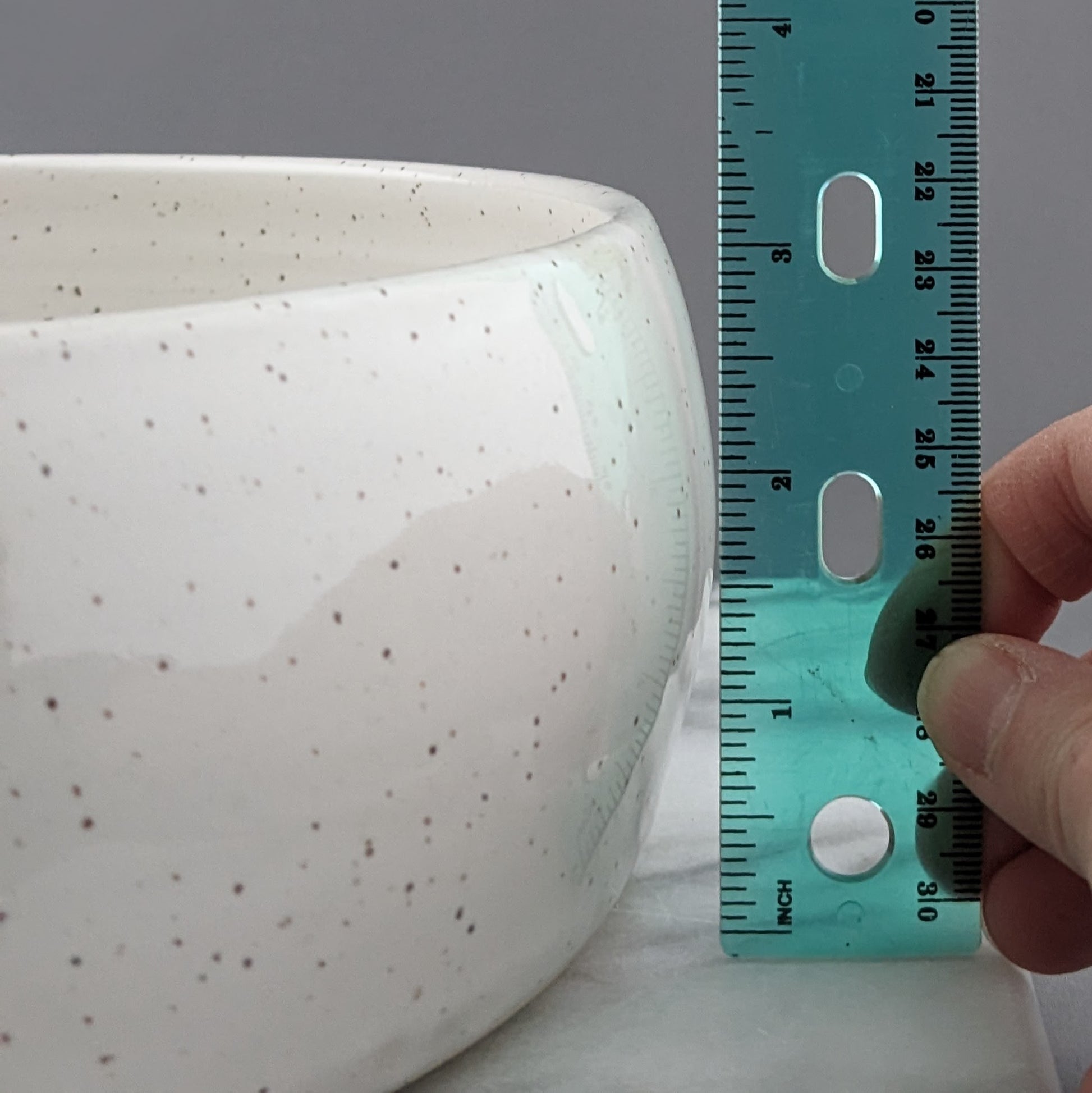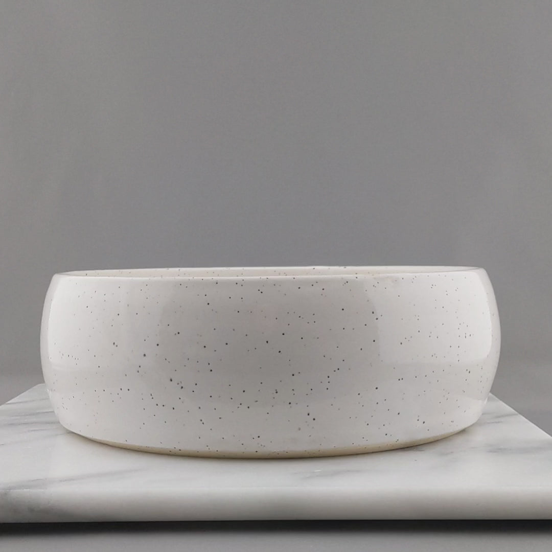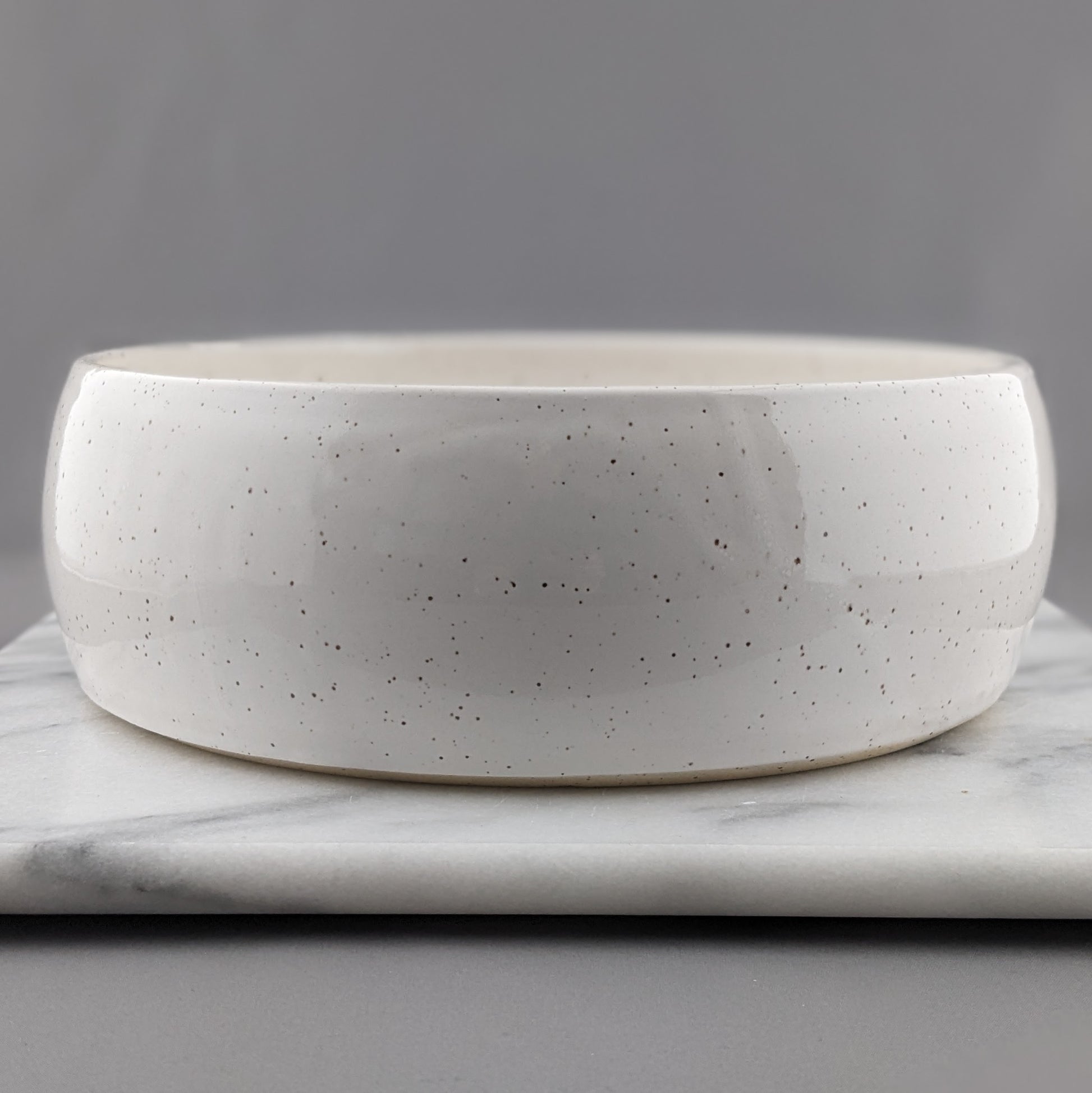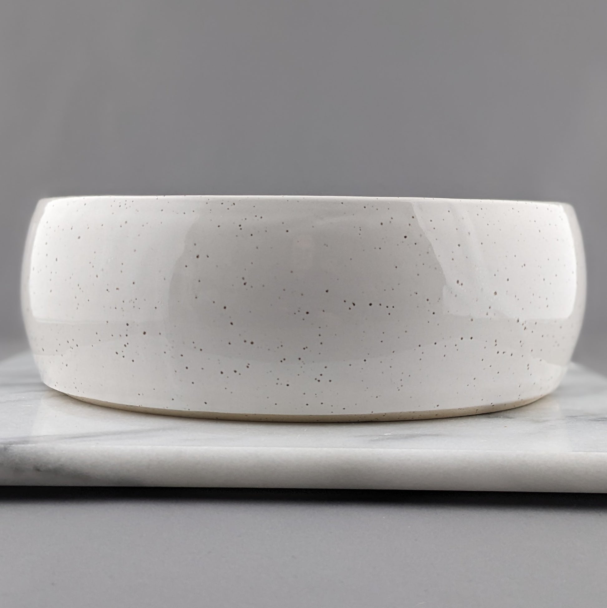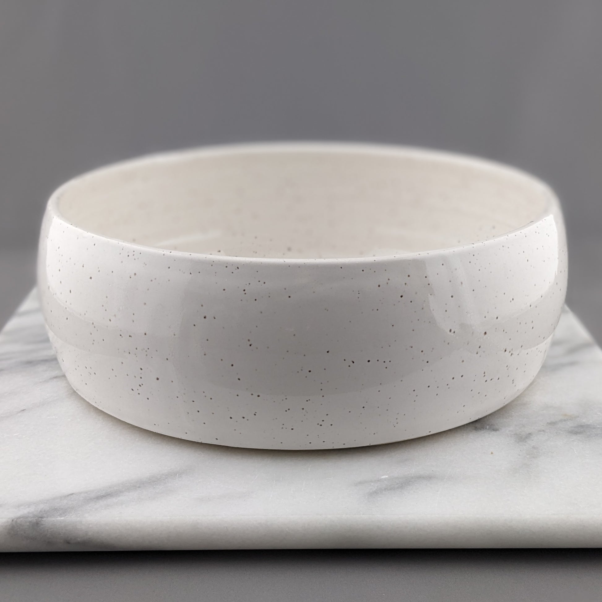 This handmade serving bowl is crafted from speckled stoneware clay and glaze in a glossy white finish. It adds a sophisticated touch to your collection of tableware, and its weight and stoneware material guarantee long-lasting durability. Measuring 9 inches diameter and just over 3 inches tall, this bowl is perfect for serving everything from salads to chili to chips. A perfect addition to elevate any table setting.