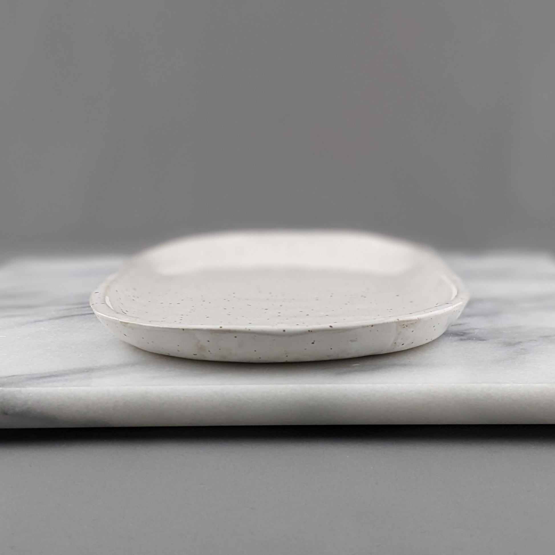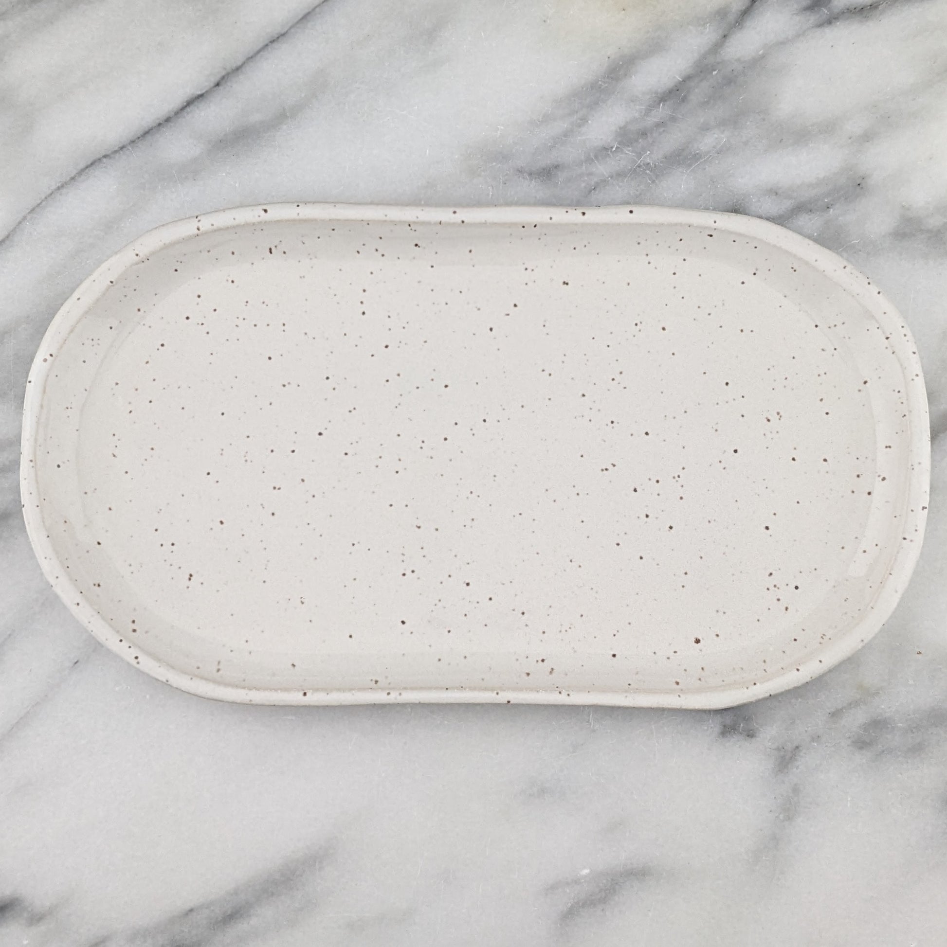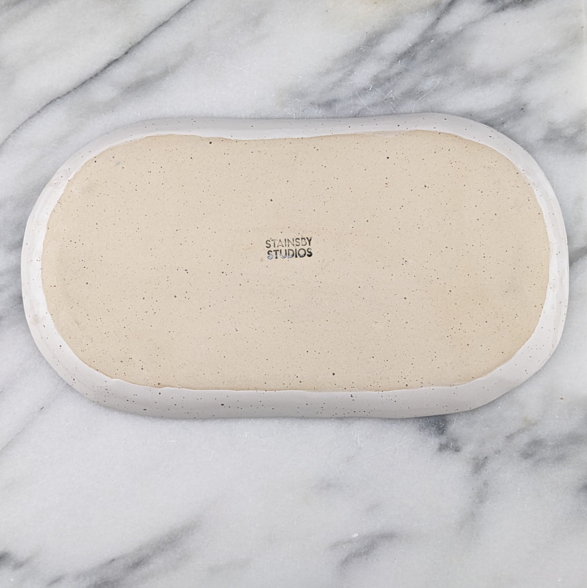 Enhance your daily routine with sophistication and charm thanks to this unique tray. Its versatility knows no bounds - keep your trinkets organized on the nightstand, keep necessities in order on the vanity, or house writing utensils and stationery at your workspace. And when you're in the mood for a light snack, use it to serve cheese, nuts, or olives. Tray is 10.25 inches long and just over 5.5 inches wide. This handcrafted speckled white tray from Stainsby Studios boasts a luxurious glazed finish, free of harmful toxins, for an elevated touch of elegance.