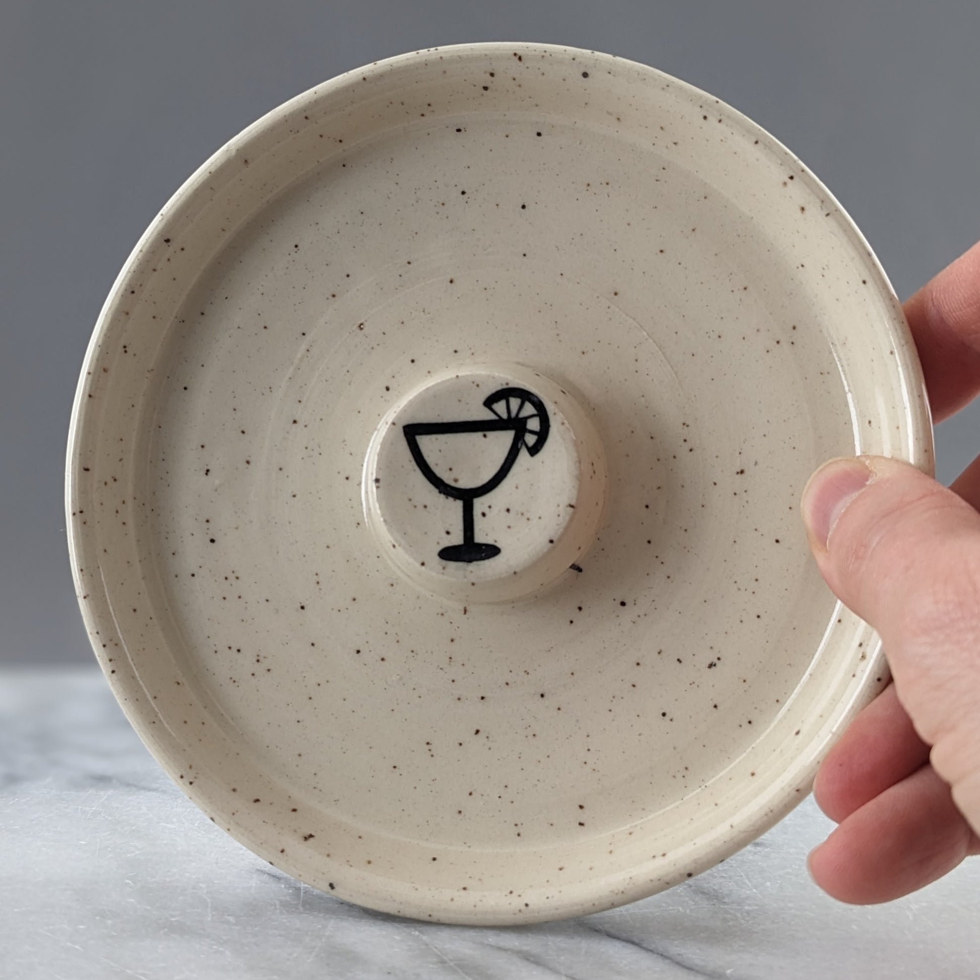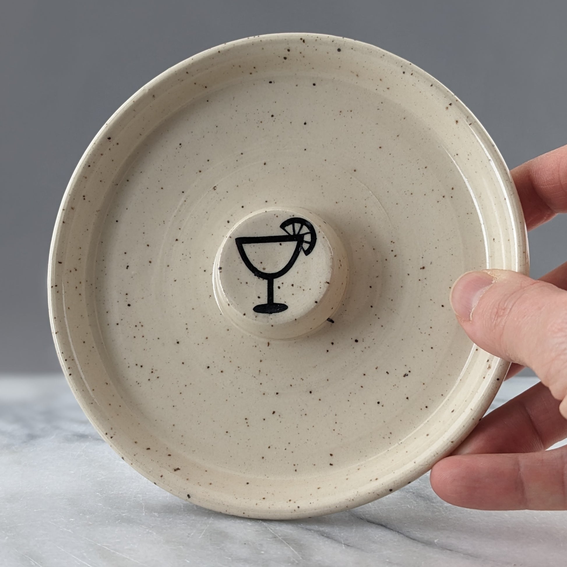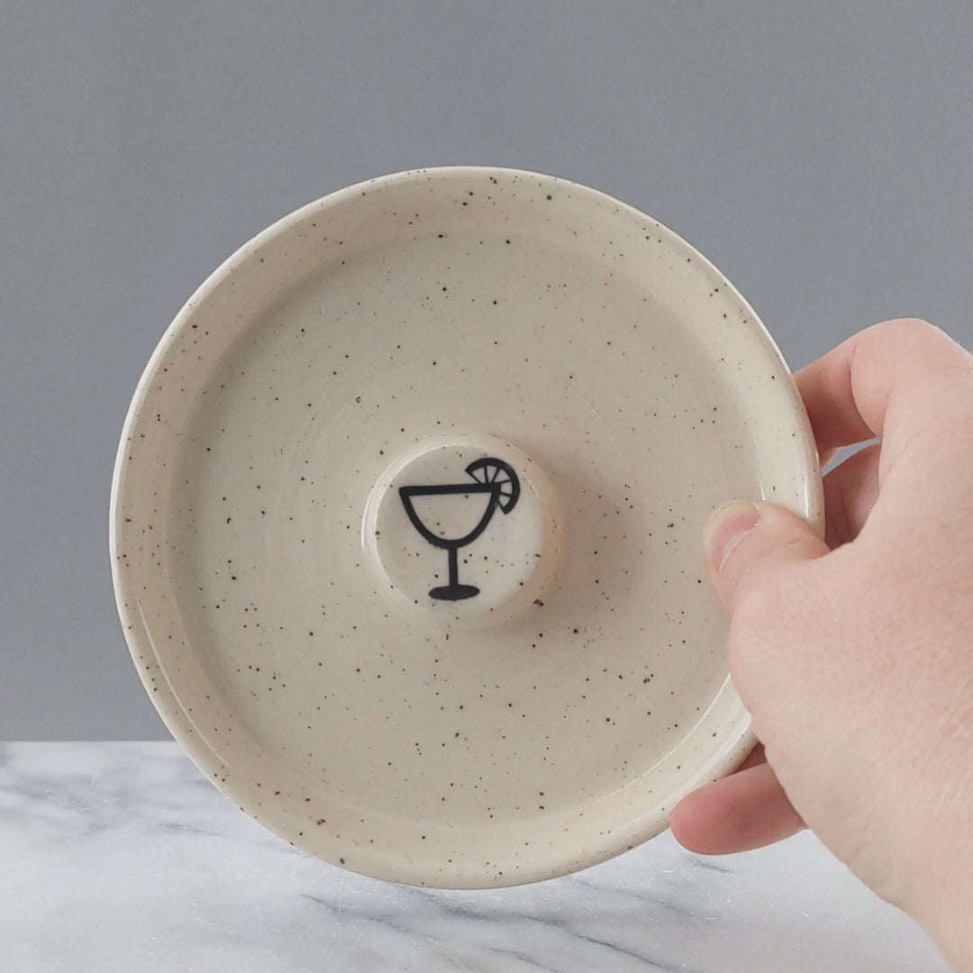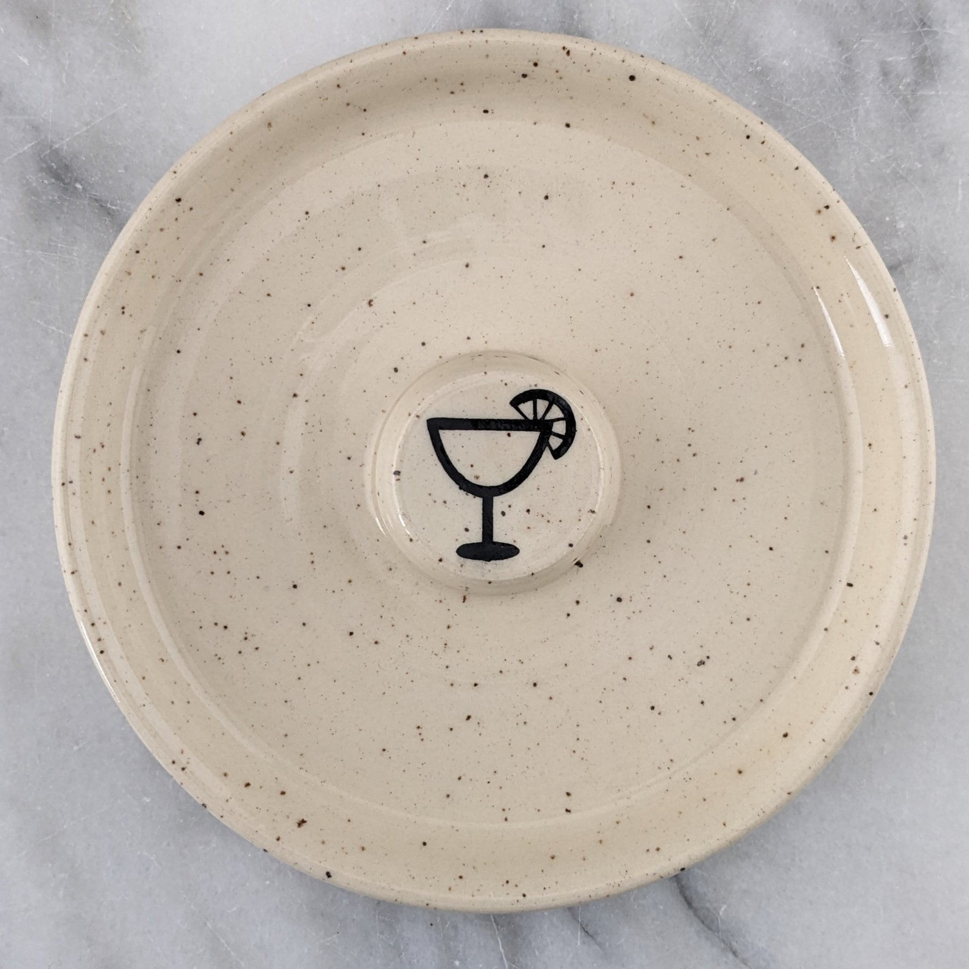 Enhance your mixology game with this artisanal sugar and salt rimmer for cocktails. Hand-crafted from luxurious stoneware, it adds a touch of elegance to every drink. Rimmer can be used with glasses up to 4.25 inches wide at the top. It is 5 inches wide and 1.25 inches tall. Perfect for elevating your home bar experience or impressing guests at your next gathering. Dishwasher safe.
