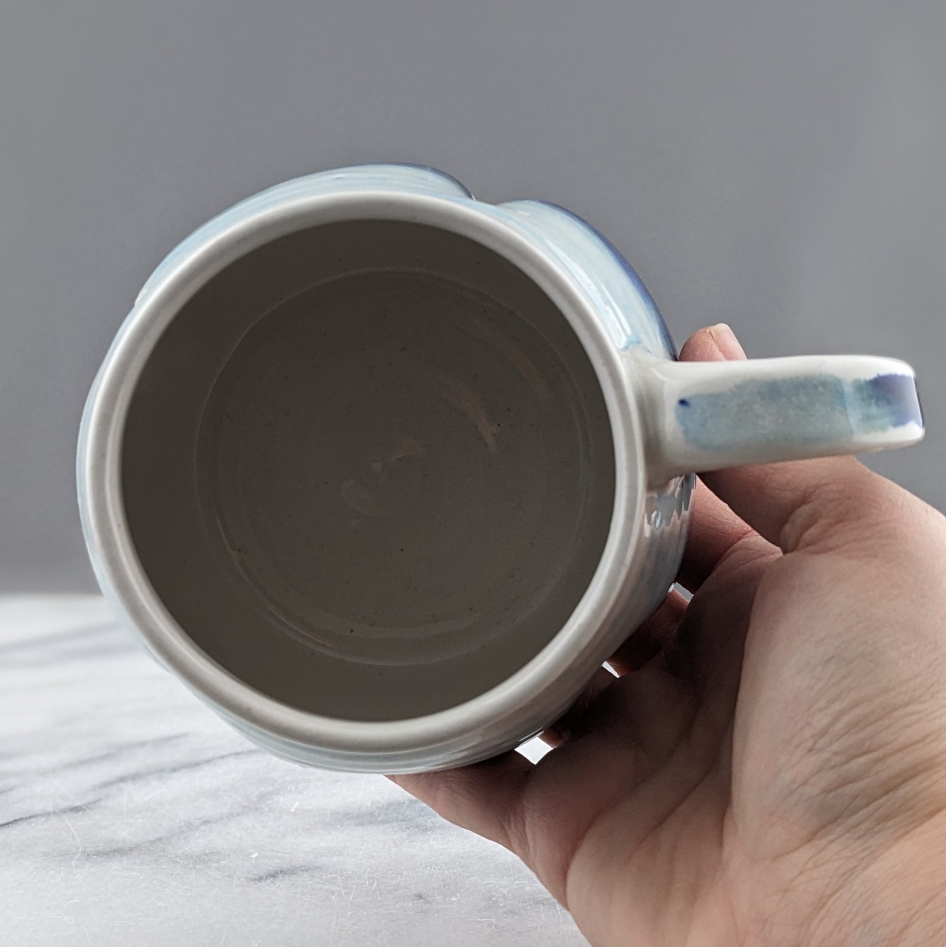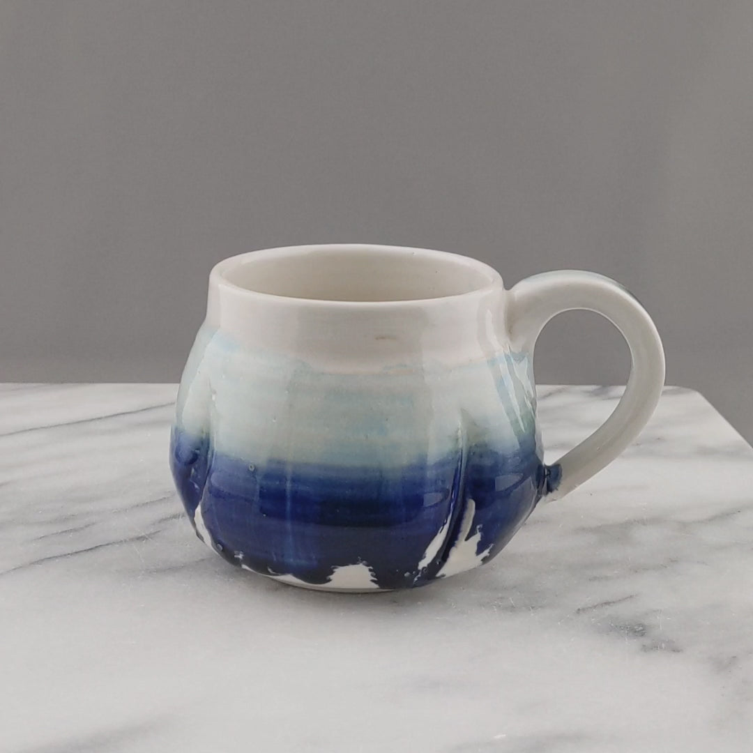 Experience the unparalleled beauty and elegance of our artisan-crafted ceramic mug. Hand glazed in stunning shades of white, light blue, and dark blue, this one-of-a-kind piece boasts a distinct cascading design that is sure to captivate. It is the ideal gift for any connoisseur of coffee or tea. Made from durable stoneware, this mug will keep your beverage hot while the comfortable handle adds a touch of convenience. Holds over 14.5 fl oz (420 mL) and is 3.25 inches tall and just over 4 inches wide at its widest. Packaged in delicate white tissue, it is the perfect gift for any special occasion.