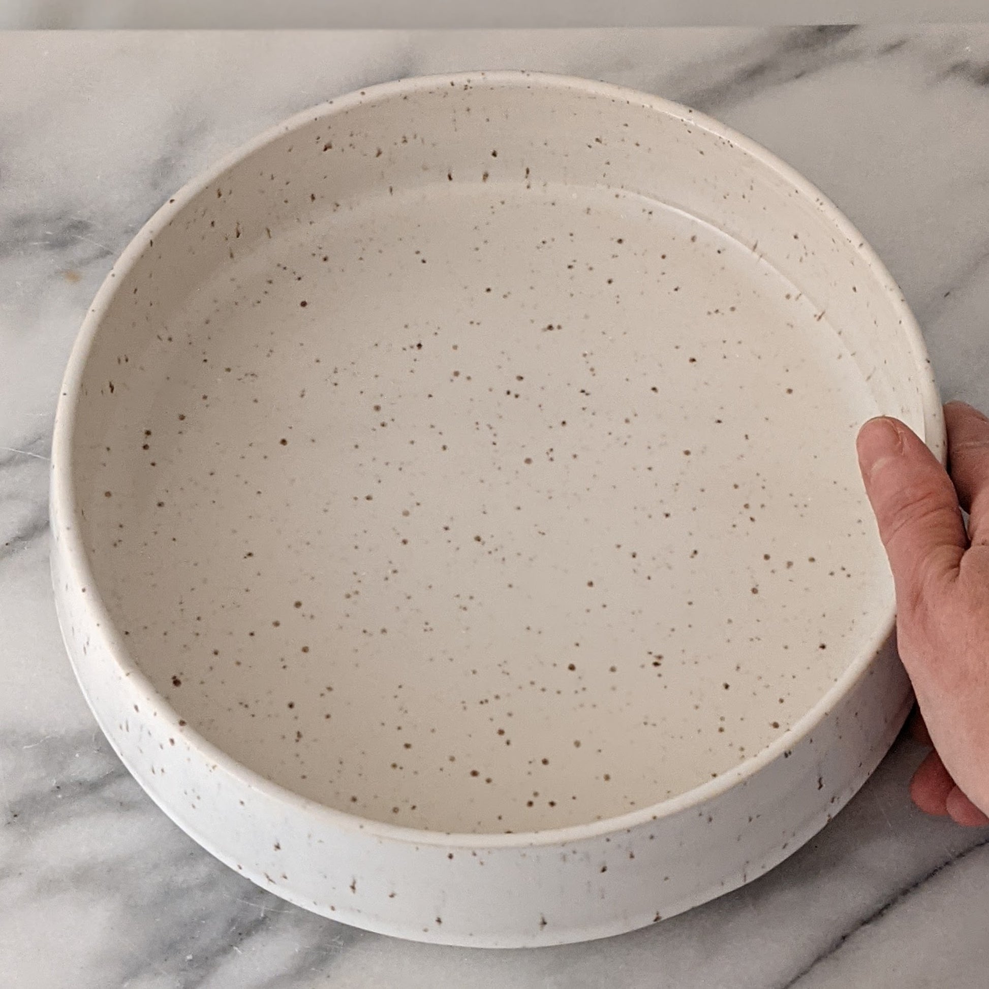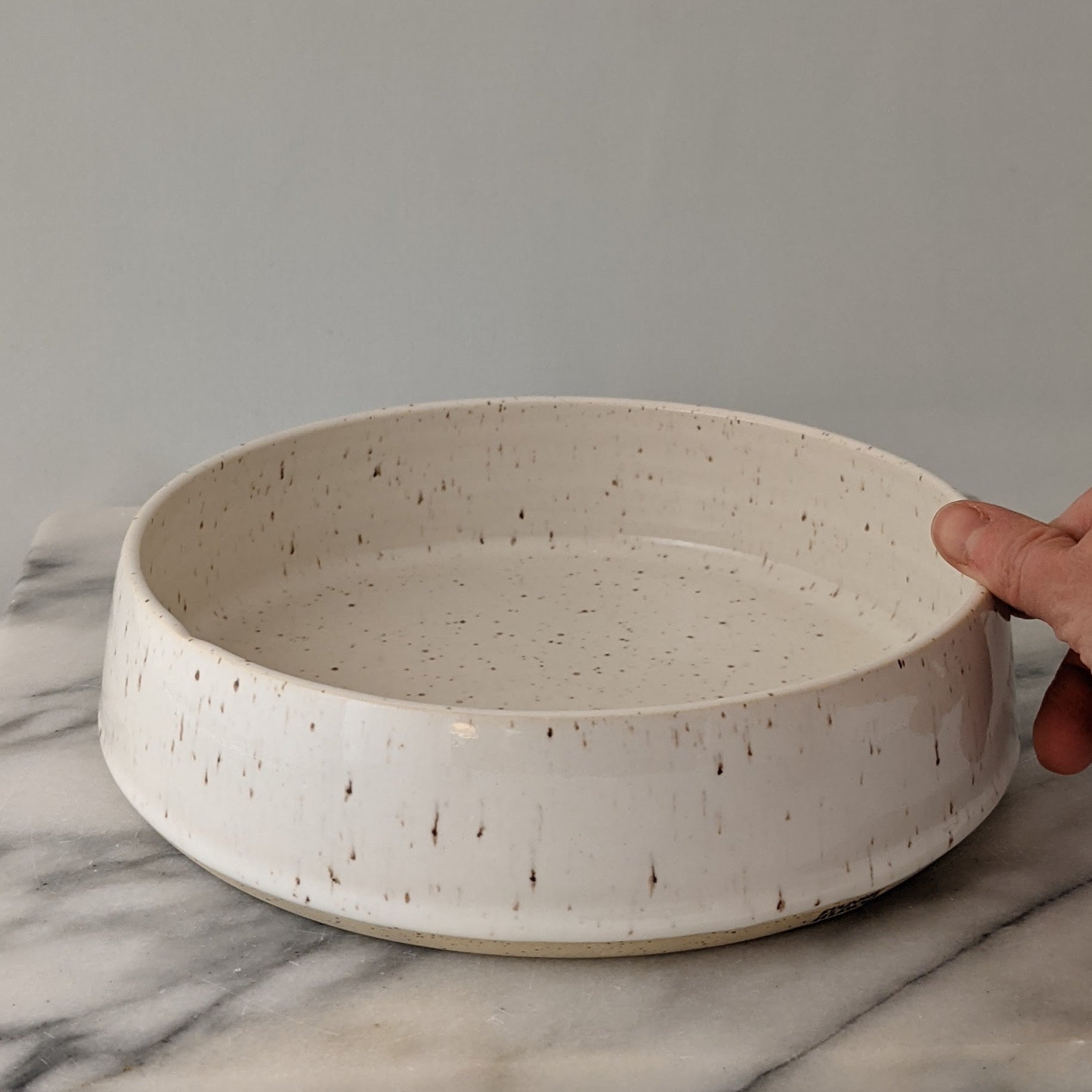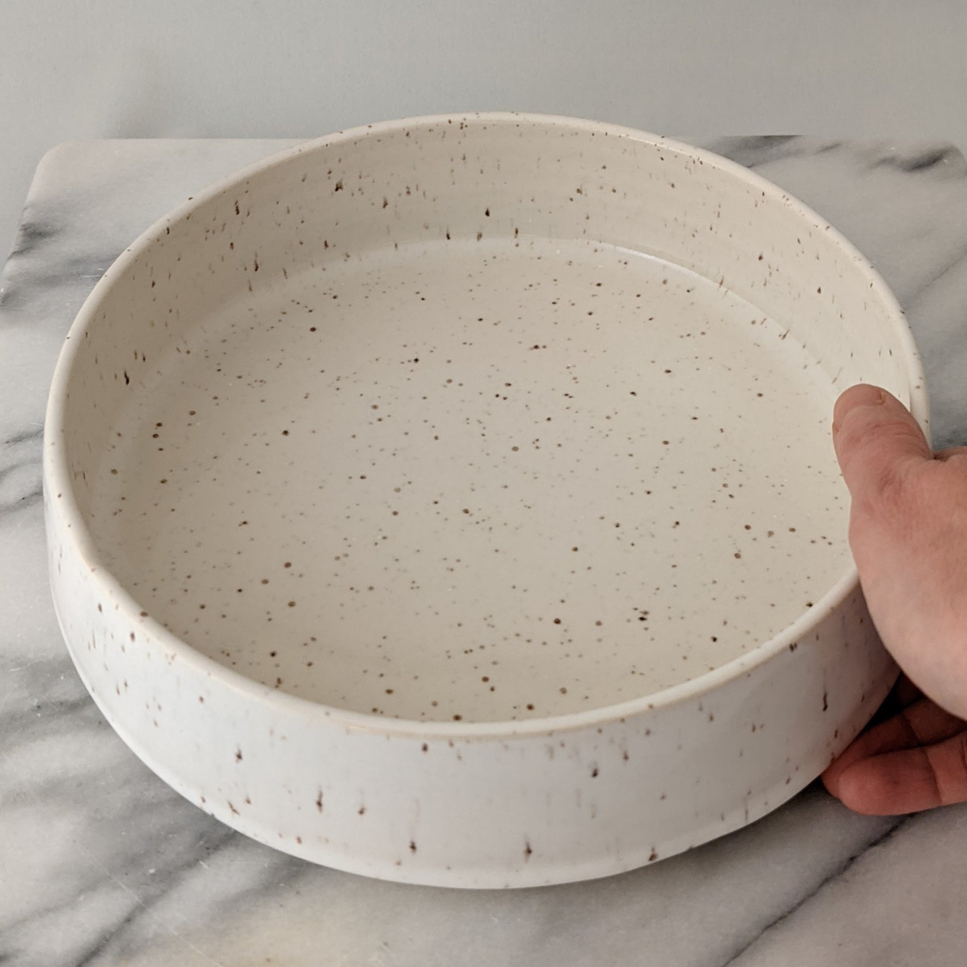 This modern handmade bowl is made of speckled stoneware clay and glazed in glossy white. It's the right size for serving salad or chips or quartered roasted potatoes. It's the perfect way to slow down and appreciate the small moments that make up a beautiful life. This dish is approximately 8.75 inches diameter and 2.5 inches high and is microwave and dishwasher safe. Like all Stainsby Studios products, this dish is glazed with non-toxic, lead-free, food-safe glazed.