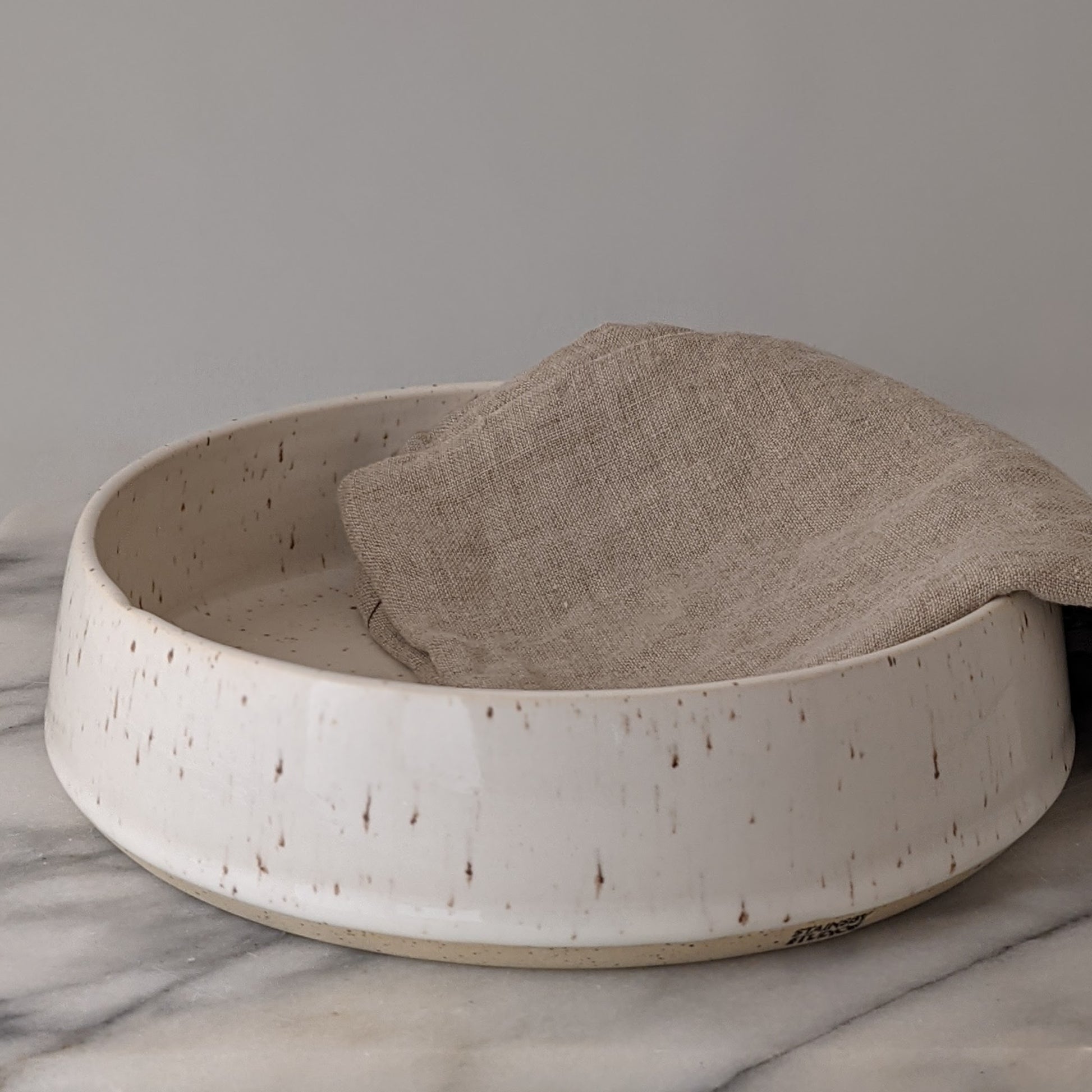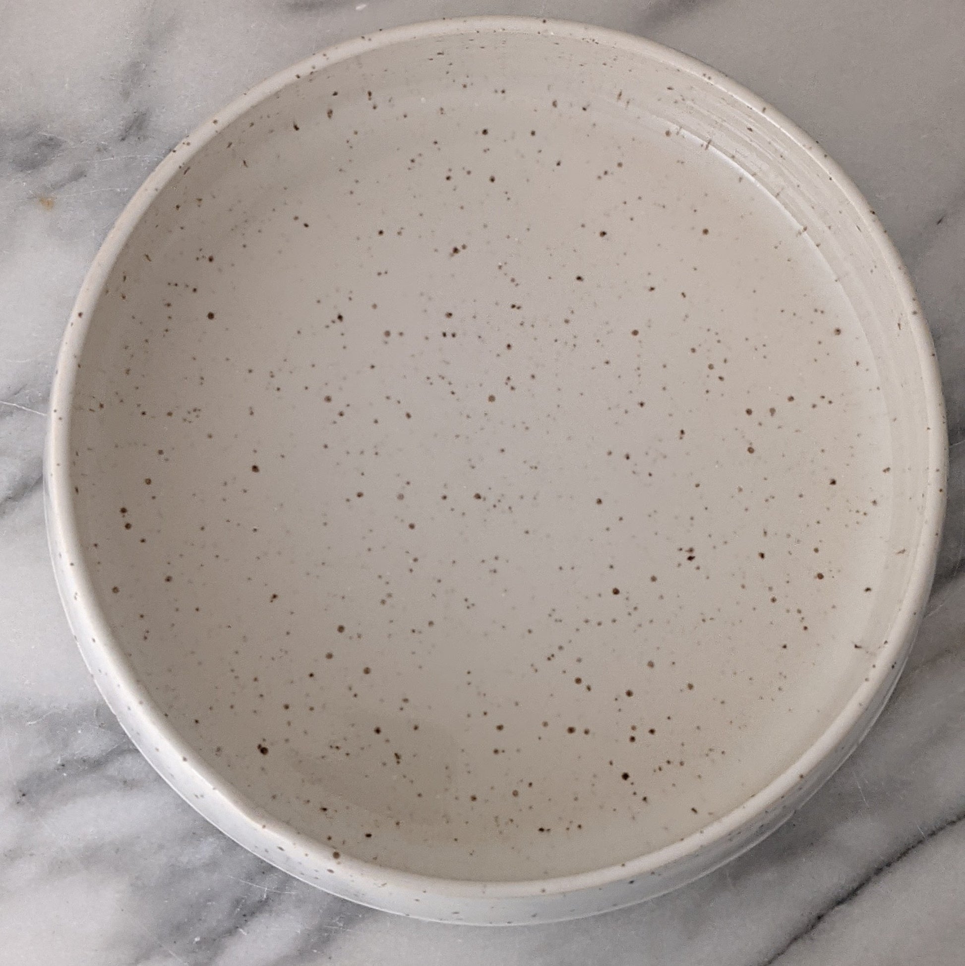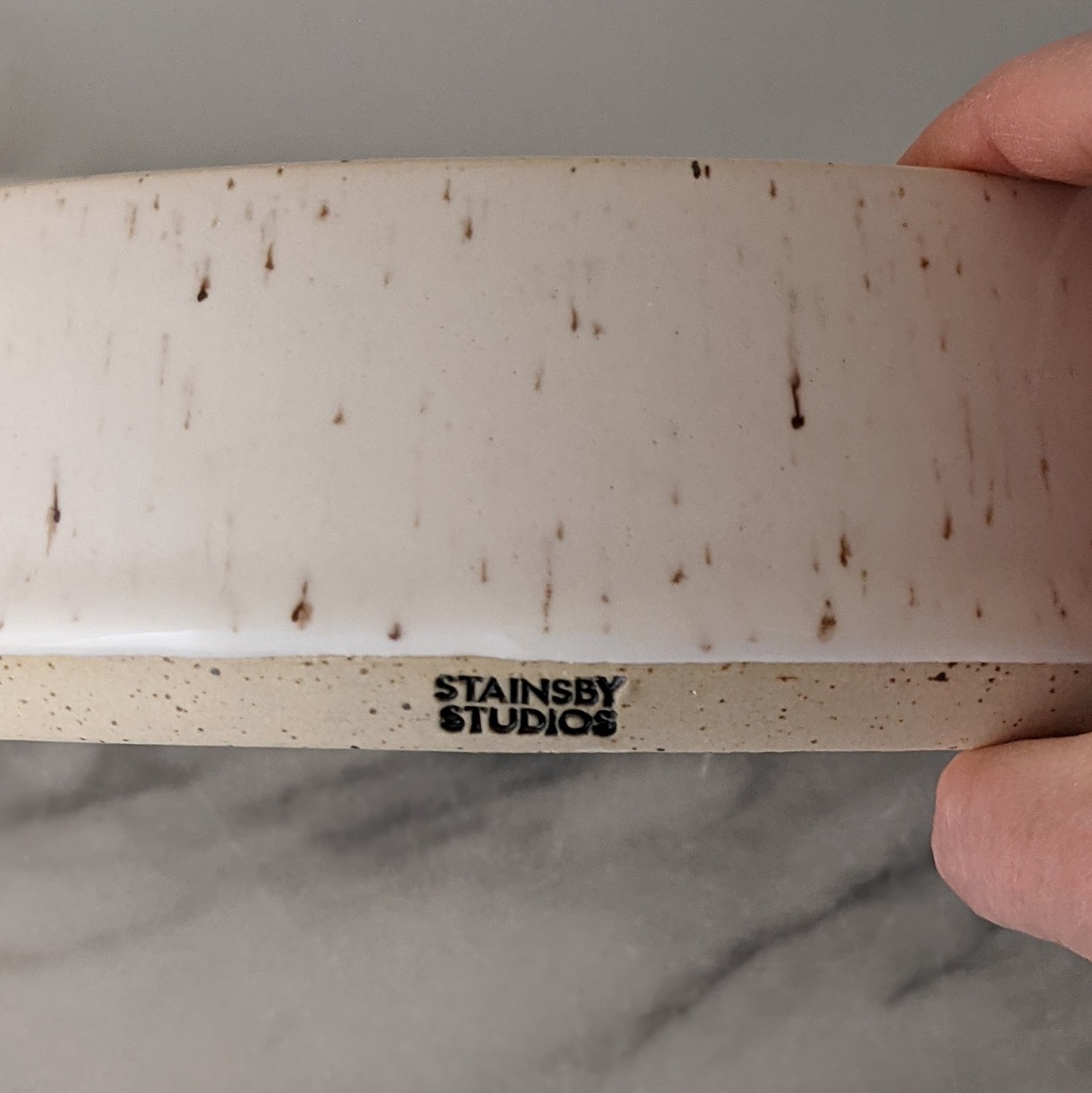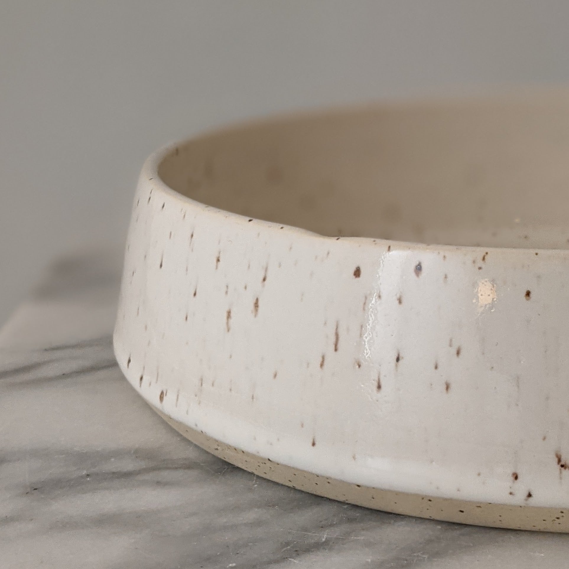 This modern handmade bowl is made of speckled stoneware clay and glazed in glossy white. It's the right size for serving salad or chips or quartered roasted potatoes. It's the perfect way to slow down and appreciate the small moments that make up a beautiful life. This dish is approximately 8.75 inches diameter and 2.5 inches high and is microwave and dishwasher safe. Like all Stainsby Studios products, this dish is glazed with non-toxic, lead-free, food-safe glazed.